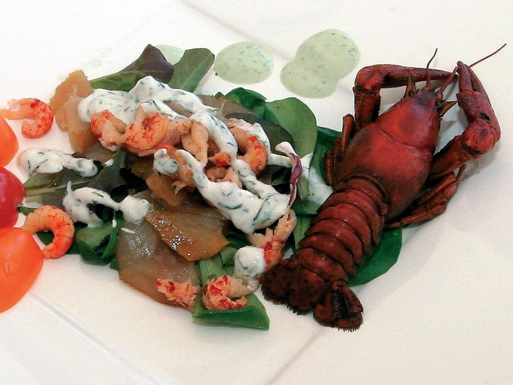 Majonez utrzeć z bryndzą, dodać posiekane orzechy, pokrojoną szynkę i posiekany koperek. Masą smarować liście sałaty i zwinąć, po wierzchu polać majonezem i posypać koperkiem, ułożyć na półmisku i udekorować pomidorem.