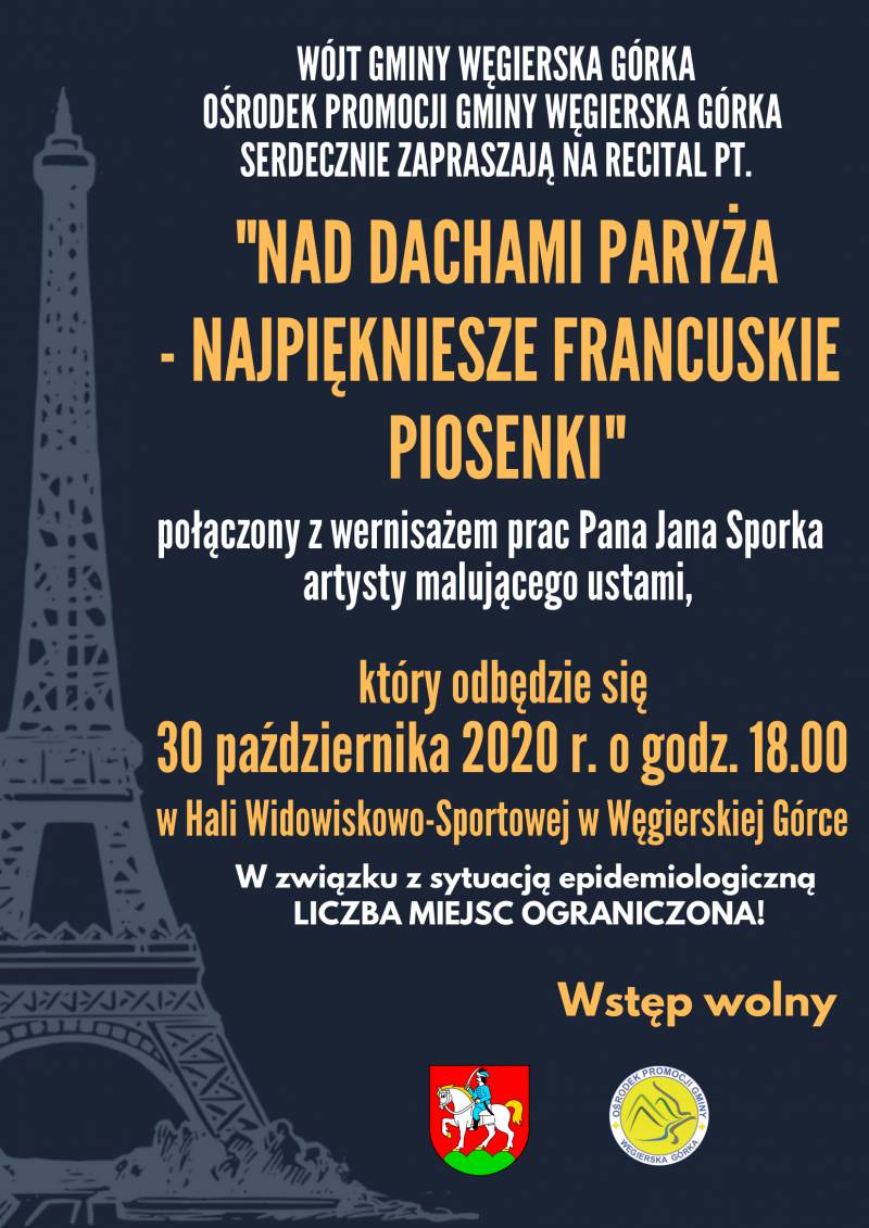Wójt Gminy Węgierska Górka oraz Ośrodek Promocji Gminy Węgierska Górka serdecznie zapraszają wszystkich chętnych na niezwykły wieczór z Recitalem pn. „Nad dachami Paryża – najpiękniejsze francuskie piosenki”. Już 30 października 2020 r. o godz. 18.00 w Hali Widowiskowo-Sportowej w Węgierskiej Górce.