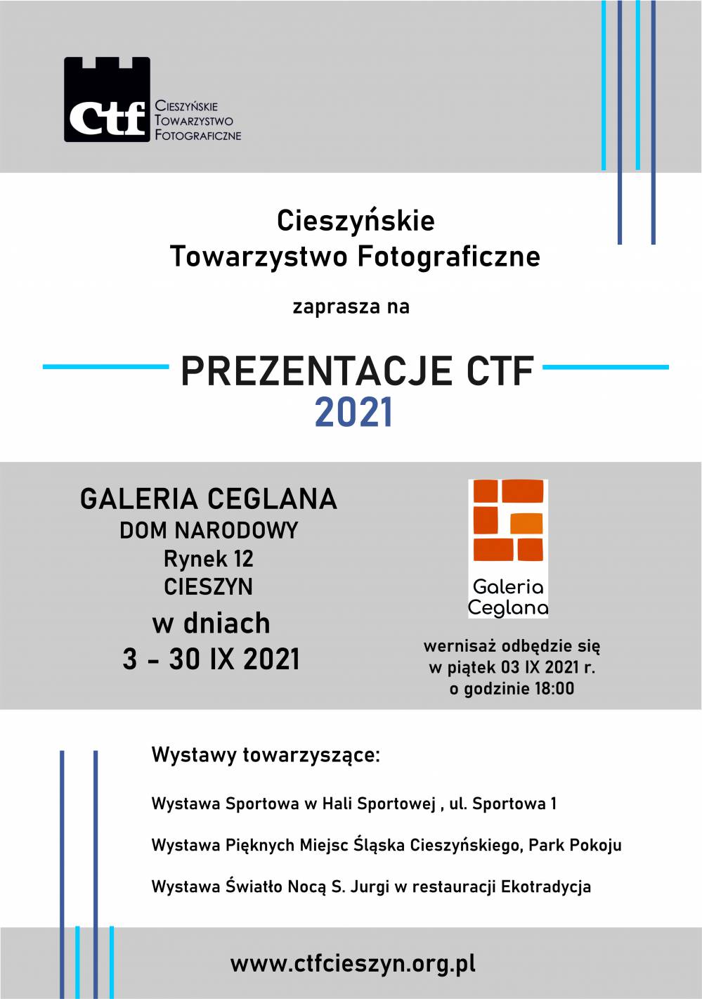 Jak co roku Cieszyńskie Towarzystwo Fotograficzne zaprasza na wystawę swoich prac. Wśród nich każdy może znaleźć coś dla siebie. Od krajobrazu miejskiego i wiejskiego, przez górskie landszafty, portret konceptualny, akt, fotografię dokumentalną, martwą naturę aż po fotografikę.Cieszyńskiego Towarzystwo Fotograficzne ma przyjemność zaprosić wszystkich na uroczyste otwarcie kolejnej zbiorowej wystawy prac. PREZENTACJE CTF 2021 odbędą się w Galerii Ceglanej Cieszyńskiego Ośrodka Kultury "Dom Narodowy" w piątek, 3 września 2021 r. o godzinie 18.00.