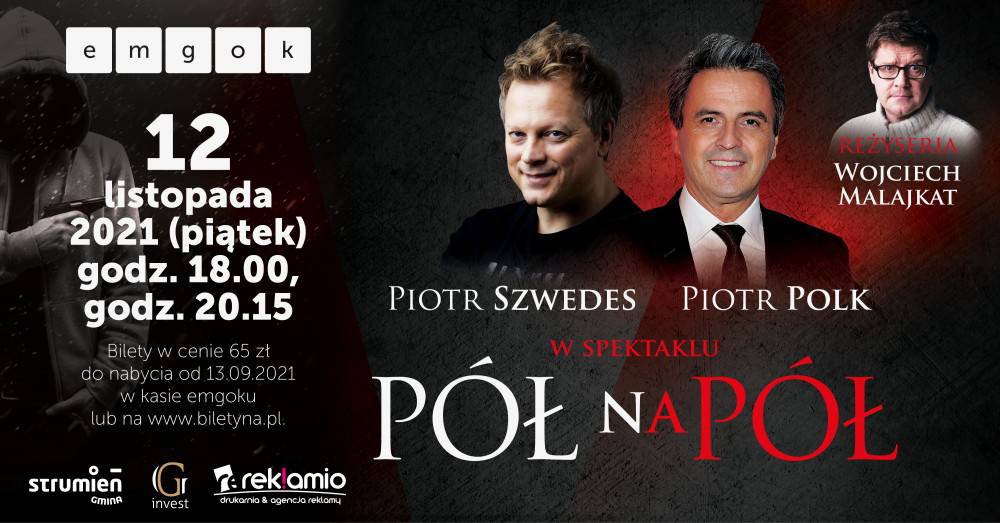 Miejsko-Gminny Ośrodek Kultury w Strumieniu zaprasza na spektakl „Pół na pół” w reżyserii Wojciecha Malajkata, w którym zagrają Piotr Szwedes i Piotr Polk.