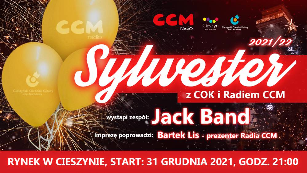 Przywitaj 2022 rok z COKiem i Radiem CCM! Wydarzenie rozpocznie się w sylwestrowy wieczór o godzinie 21:00 na cieszyńskim rynku! Imprezę poprowadzi prezenter Radia CCM Bartek Lis a na dużej scenie wystąpi zespół JACK BAND.