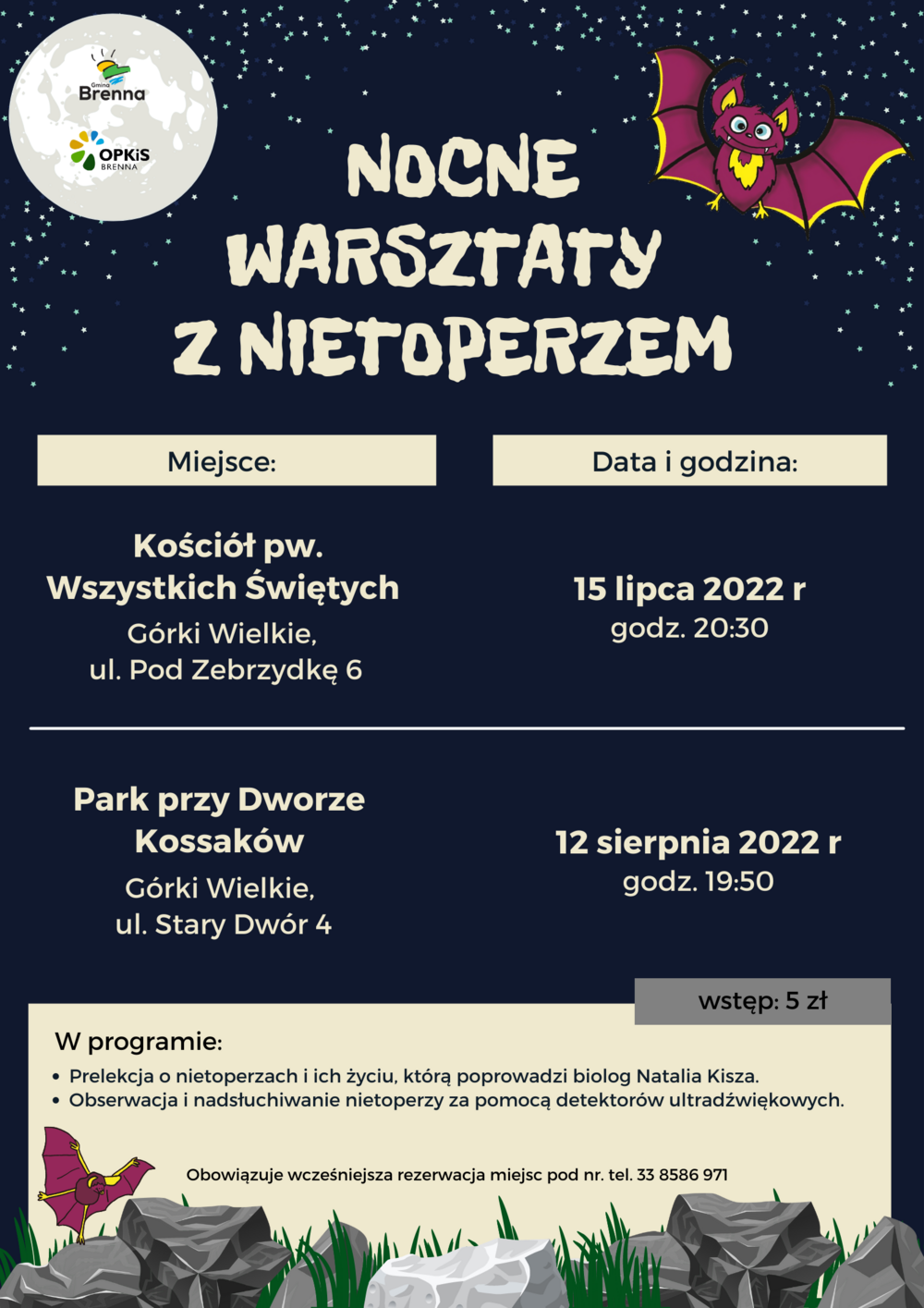 Serdecznie zapraszamy na "Nocne warsztaty z nietoperzem", realizowane w ramach projektu "Poznaj Zwierza Nietoperza - mieszkańaca gminy Brenna", które pozwolą na pokazanie życia nietoperzy w kilku miejscach w gminie Brenna.
