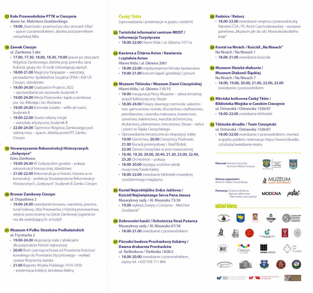 19.15-24.00 ekspozycja stała „Na skrzyżowaniu dziejów i kultur”; mini-wykłady: 19.30 II wojna światowa na Śląsku Cieszyńskim; 19.30 J. Piłsudski i arc. Eugeniusz – modele Jana Raszki; 20.00 Stroje ludowe Śląska Cieszyńskiego; 20.00 Rotunda cieszyńska; 20.30 Medycyna i higiena XVIII w.; 20.30 O fenomenie cieszynki; 21.00 Ks. Szersznik i gabinety osobliwości; 21.00 Plebiscit 1920 (w jęz. czeskim) 21.30 Tragedia Pod Wałką 1942; 22.00 Obrzędy i zwyczaje Śląska Cieszyńskiego; 22.30 Złoty Wiek Cieszyna; 23.00 Ks. Szersznik i gabinety osobliwości