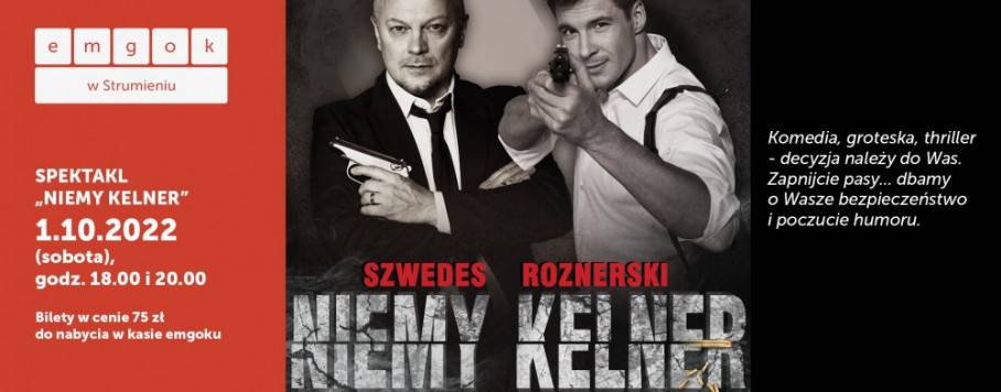 Miejsko-Gminny Ośrodek Kultury w Strumieniu i Kompania Teatralna zapraszają Państwa do pokoju w dziwnym hotelu z dwoma co najmniej dziwnymi gangsterami, i jeszcze bardziej dziwnym dyspozytorem, który z zewnątrz steruje naszymi bohaterami… Co wydarzy się w pokoju? Kto kogo „kilim”? Sprawdźcie koniecznie! W sobotę 1 października 2022 r. na scenie sali widowiskowej w Strumieniu staną Piotr Szwedes i Mikołaj Roznerski. Komedia, groteska, thriller… decyzja należy do Państwa! Zapraszamy na spektakl „Niemy Kelner”!