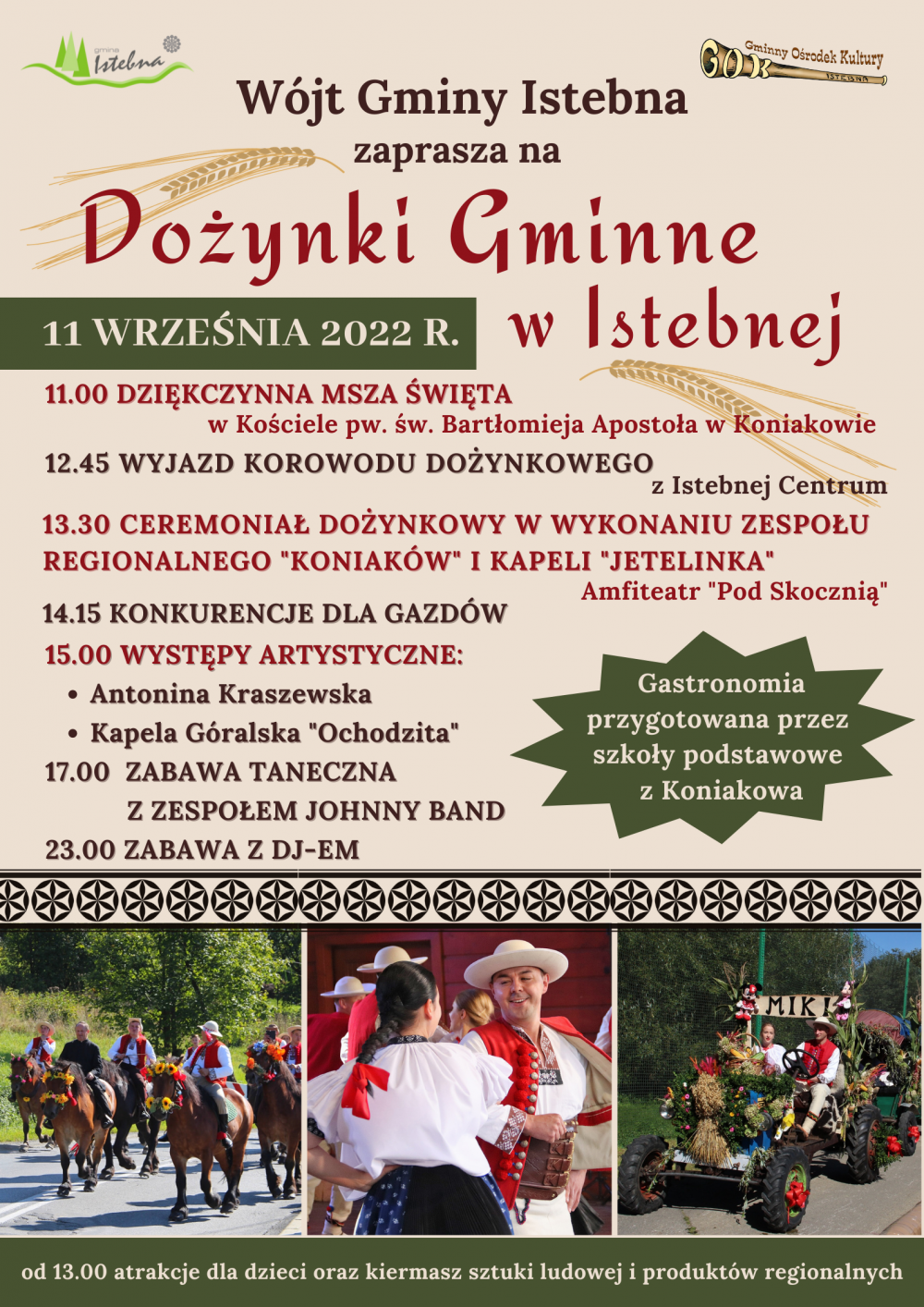 Wójt Gminy Istebna zaprasza na Dożynki Gminne, które odbędą się w niedzielę 11 września i będą zwieńczeniem tegorocznego cyklu letnich imprez plenerowych. Jak nakazuje tradycja nie zabraknie uroczystości kościelnych, w które włączą się wszystkie parafie Dekanatu Istebniańskiego, a także pięknego, barwnego korowodu. Z tej okazji nasi mieszkańcy już niemal dwa tygodnie wcześniej czynią starania by ten dzień miał szczególnie odświętny charakter – bogate zdobienia kościołów, umajone wozy i stroje regionalne, to wszystko sprawia, że w wydarzeniu tym naprawdę warto uczestniczyć.