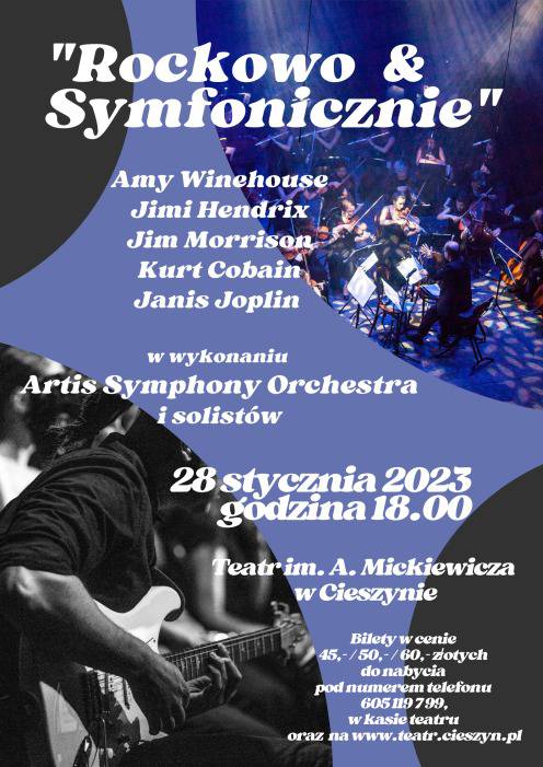 Zapraszamy 28 stycznia 2023r na niezwykły koncert - Rockowo & Symfonicznie. Koncert, podczas którego przeniesiemy się do rockowo - symfonicznych brzmień zespołu The Doors, Jimiego Hendrixa, Janis Joplin, Nirvany oraz Amy Winehouse. Taka historia rocka w pigułce obejmująca prawie 50 lat brzmień tego gatunku muzycznego.