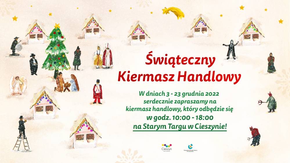 Od 3 do 23 grudnia w Cieszynie będzie się odbywał świąteczny kiermasz handlowy. W tym roku ze względu na remont płyty rynku, kiermasz zostanie przeniesiony na Stary Targ. Zapraszamy codziennie od 3 do 23 grudnia w godzinach 10:00 - 18:00!