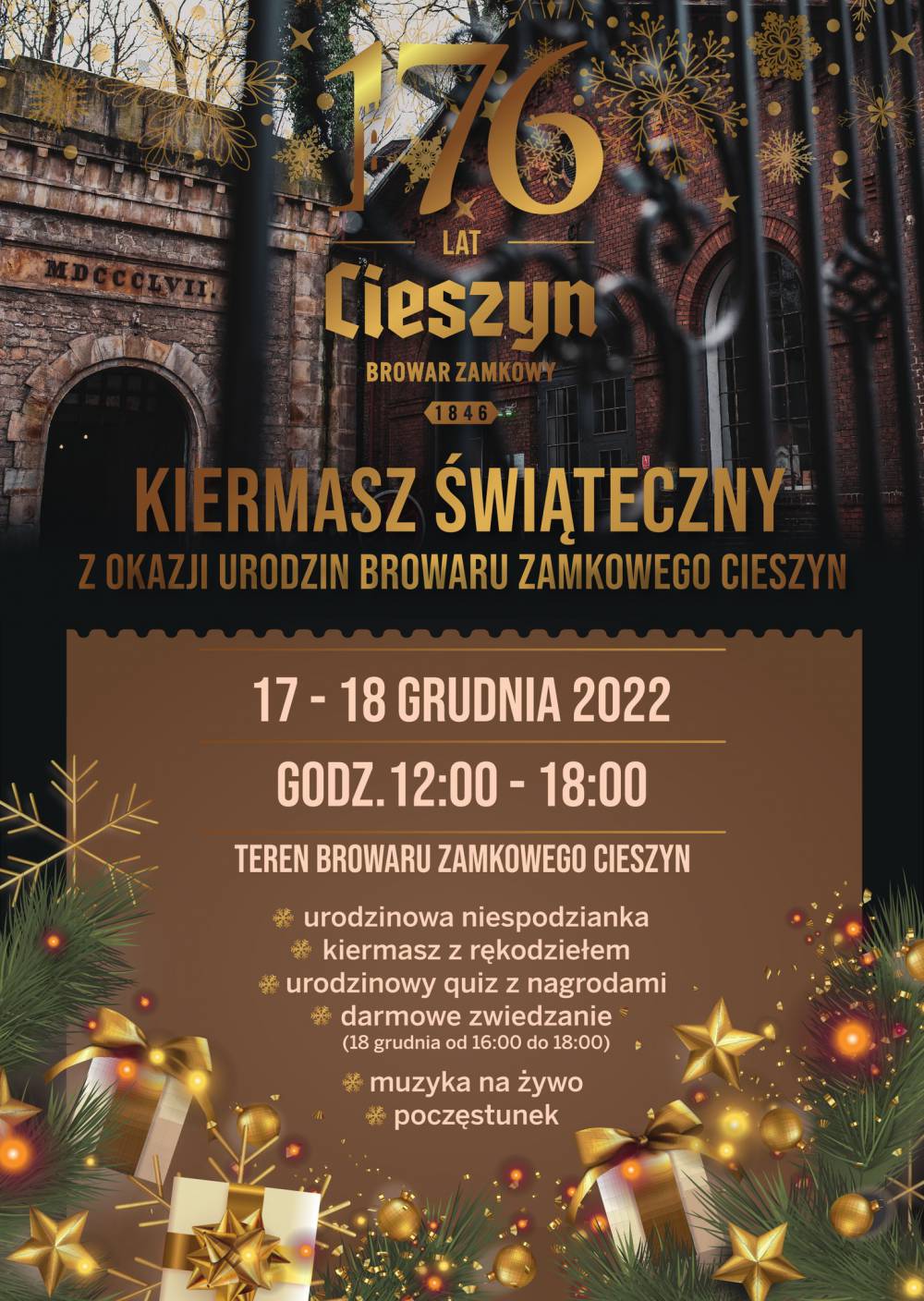 W tym roku z okazji urodzin Browaru Zamkowego Cieszyn zapraszamy na świąteczny kiermasz! Będziemy świętować wspólnie w bożonarodzeniowej atmosferze na terenie Browaru w weekend 17-18 grudnia w godzinach od 12:00 do 18:00.