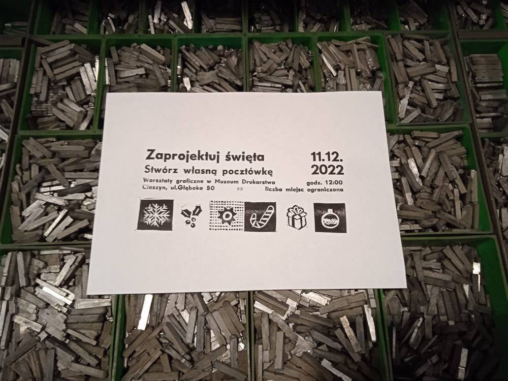 Zapraszamy 11 grudnia do Muzeum Drukarstwa na warsztaty graficzne organizowane w ramach wydarzenia Zaprojektuj święta. Zadaniem uczestników będzie przygotowanie formy drukarskiej, z której następnie będziemy odbijać świąteczne pocztówki. Zapewniamy narzędzia, materiały i dobrą zabawę. Liczba miejsc ograniczona. Dzieci mogą uczestniczyć w warsztatach tylko pod opieką rodziców.
