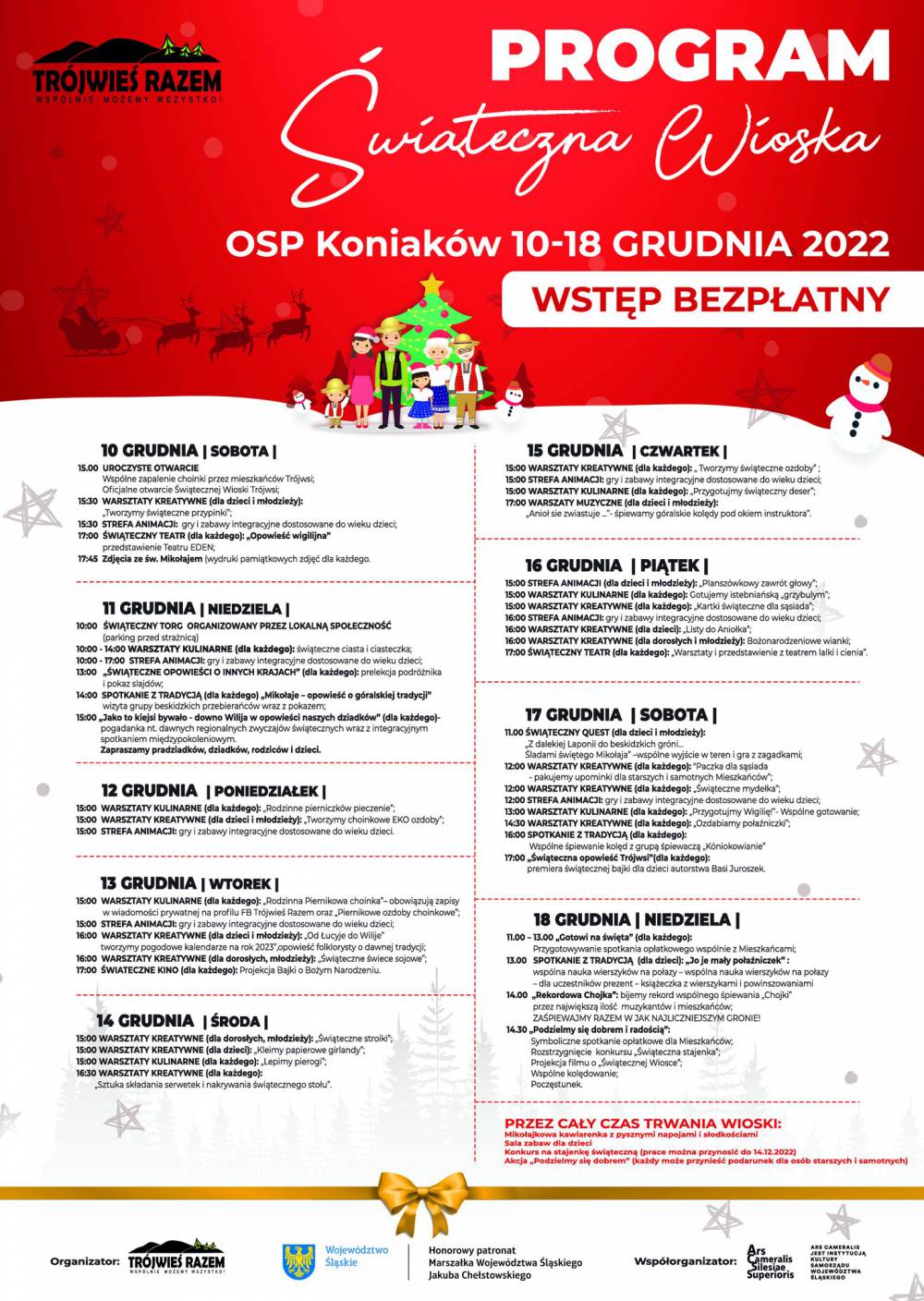 W dniach od 10 do 18 grudnia na terenie OSP Koniaków funkcjonować będzie Świąteczna Wioska, podczas której będzie można wziąć udział w naprawdę w wielu wydarzeniach! Wszystkie warsztaty są bezpłatne.