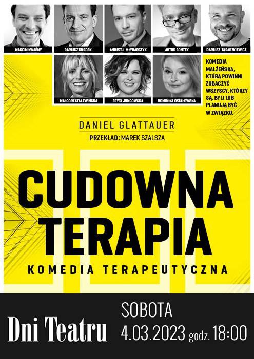 Joanna - Dominika Ostałowska (wymiennie z Edytą Jungowską i Olgą Bończyk) - egzystencjalna zapaśniczka, kobieta z pretensją, Walenty – Dariusz Kordek (wymiennie z Marcinem Kwaśnym) - nadwrażliwy choleryk rozwiązujący problemy za pomocą piły tarczowej czyli państwo Dorek, to doświadczone małżeństwo, które postanawia się rozstać. Przed ostateczną decyzją wybierają się jednak do wybitnego psychoterapeuty - Artur Pontek (wymiennie z i Dariuszem Tarszkiewiczem), tym samym dając sobie ostatnią szansę. Czy za pomocą tradycyjnych metod i ćwiczeń uda się wybitnemu specjaliście pojednać parę, której jedynym punktem wspólnym jest urządzanie sobie piekła ? Gdzie jest granica wytrzymałości psychoterapeutycznego profesjonalizmu? Kto tu jest wariatem: pacjent czy prowadzący terapię? Co takiego może zrodzić się kilkadziesiąt metrów pod wodą? Odpowiedzi na te pytania znajdziecie Państwo w najnowszej inscenizacji sztuki D. Glattauera "Cudowna terapia".