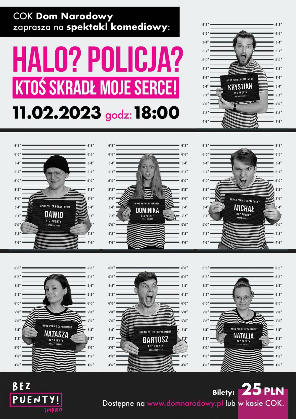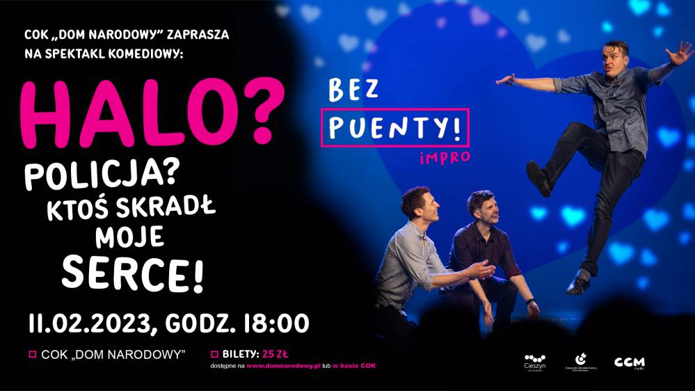 Cieszyński Ośrodek Kultury "Dom Narodowy" zaprasza na improwizowany spektakl komediowy z okazji walentynek! Wystąpi dla nas grupa Bez Puenty Impro w programie "Halo? Policja? Ktoś skradł moje serce!" Wydarzenie odbędzie się w sobotę 11 lutego 2023 r. o godzinie 18:00 w sali widowiskowej Domu Narodowego w Cieszynie.