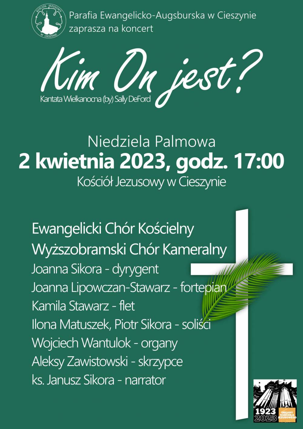 Parafia Ewangelicko-Augsburska w Cieszynie serdecznie zaprasza na wyjątkowy koncert w Niedzielę Palmową, 2 kwietnia 2023 o godz. 17.00 w Kościele Jezusowym. Po raz pierwszy w Polsce wykonana zostanie Kantata Wielkanocna „Kim On jest?” amerykańskiej kompozytorki Sally DeFord w tłumaczeniu Piotra Sikory.