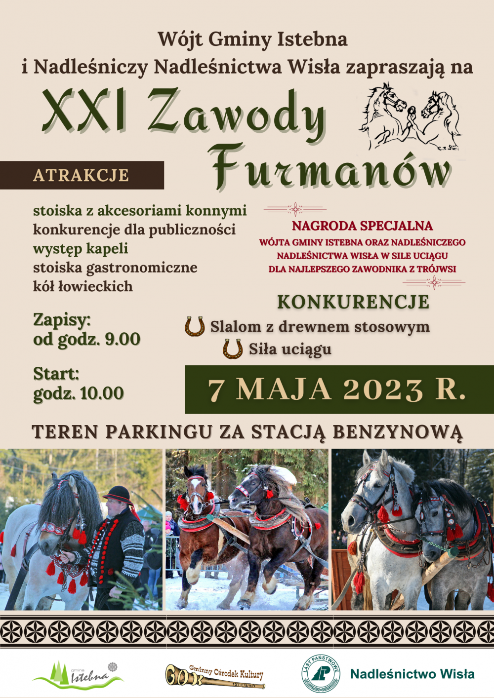 W tegorocznej edycji Zawodów Furmanów przyznana zostanie Nagroda specjalna od Wójta Gminy Istebna i Nadleśniczego Nadleśnictwa Wisła w sile uciągu dla najlepszego zawodnika z Trójwsi – 1000 zł.