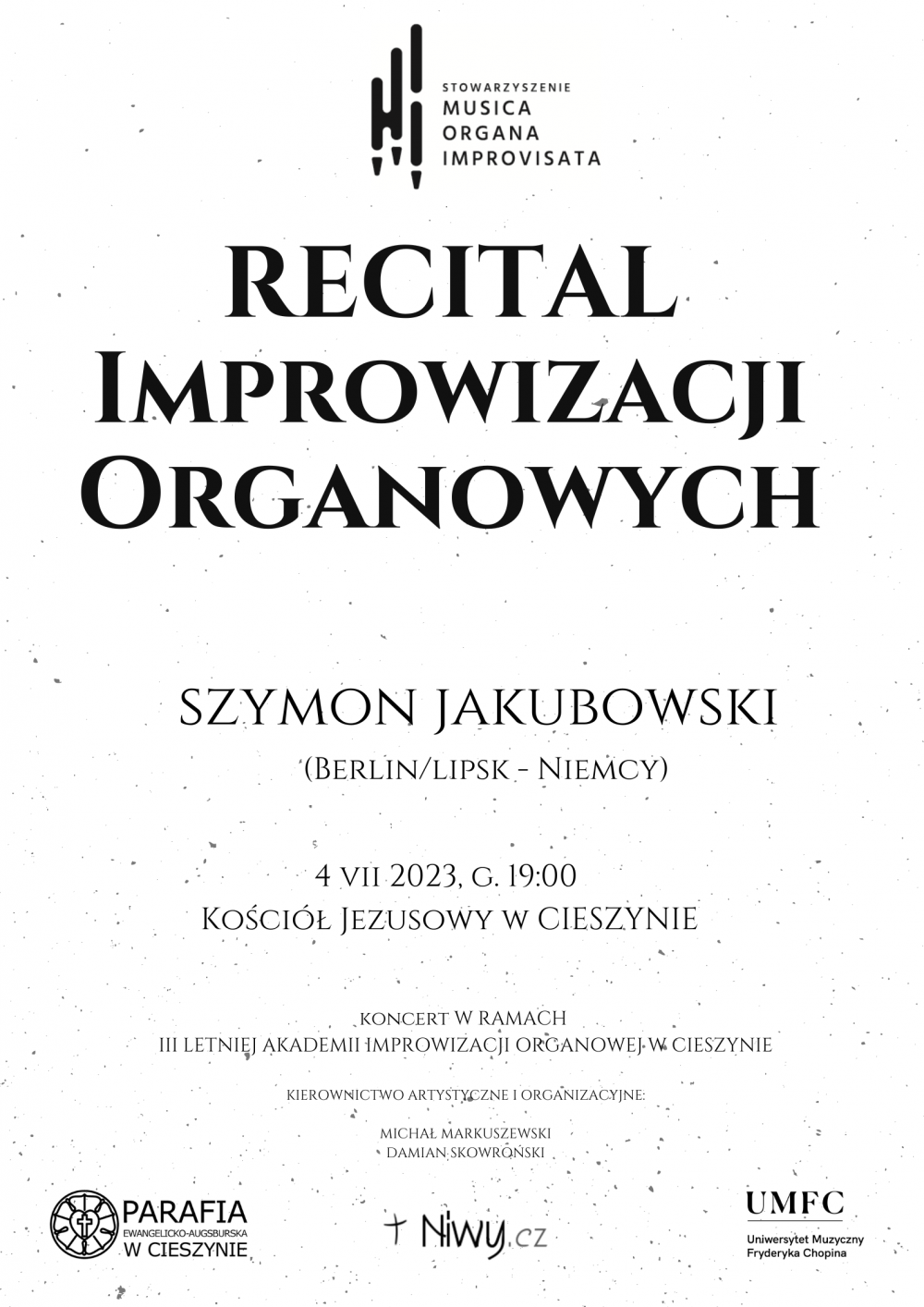 Zapraszamy serdecznie na recital improwizacji organowej w wykonaniu Szymona Jakubowskiego (Berlin/Lipsk-Niemcy), który odbędzie się 4 lipca 2023 r. w Kościele Jezusowym w Cieszynie. Koncert ten zainauguruje III Letnią Akademię Improwizacji Organowej w Cieszynie.