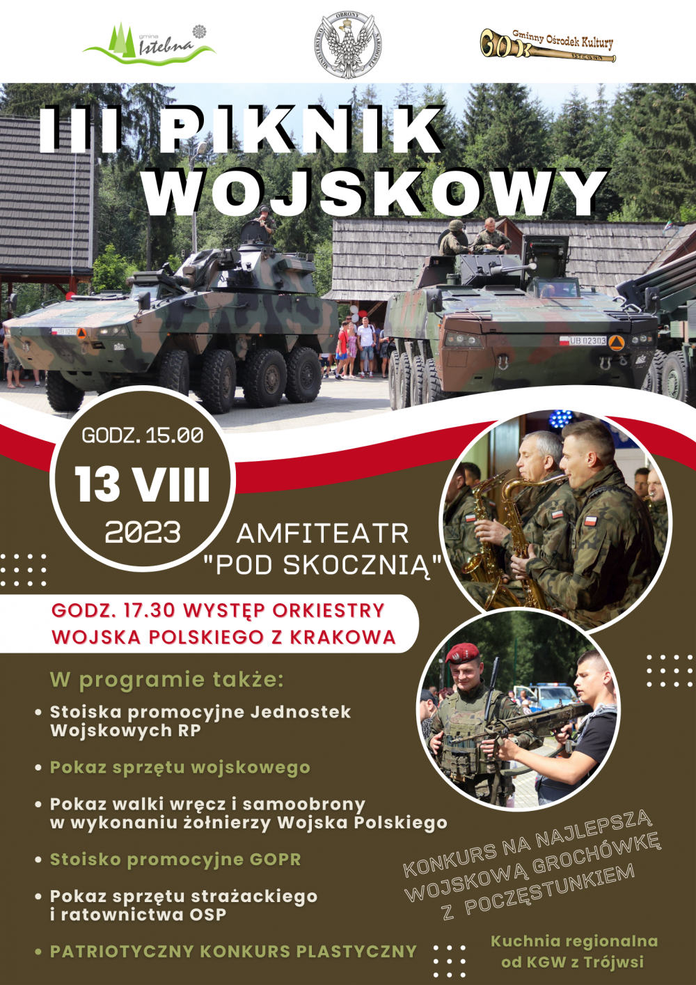 Wójt Gminy Istebna zaprasza na III Piknik Wojskowy, jaki odbędzie się w niedzielę 13 sierpnia 2023 na terenie Amfiteatru "Pod Skocznią"