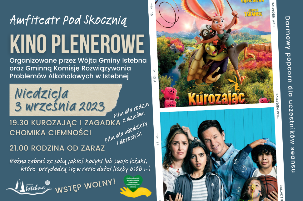 Wójt Gminy Istebna Łucja Michałek- Chudecka wraz z Gminną Komisją Rozwiązywania Problemów Alkoholowych serdecznie zapraszają na dwa seanse filmowe, które będą miały miejsce 3 września (niedziela) w Amfiteatrze pod Skocznią.