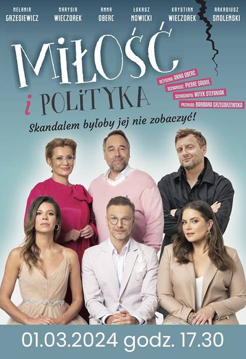 Teatr im. A. Mickiewicza w Cieszynie zaprasza na spektakl "Miłość i polityka", który odbędzie się w piątek, 01 marca 2024, o godzinie 17:30 oraz 20:30.
