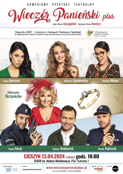 Zapraszamy 13 kwietnia 2024r. do Teatru im. A. Mickiewicza na Spektakl "WIECZÓR PANIEŃSKI PLUS" - najnowszą komedię Marcina Szczygielskiego w reżyserii Marii Seweryn.
