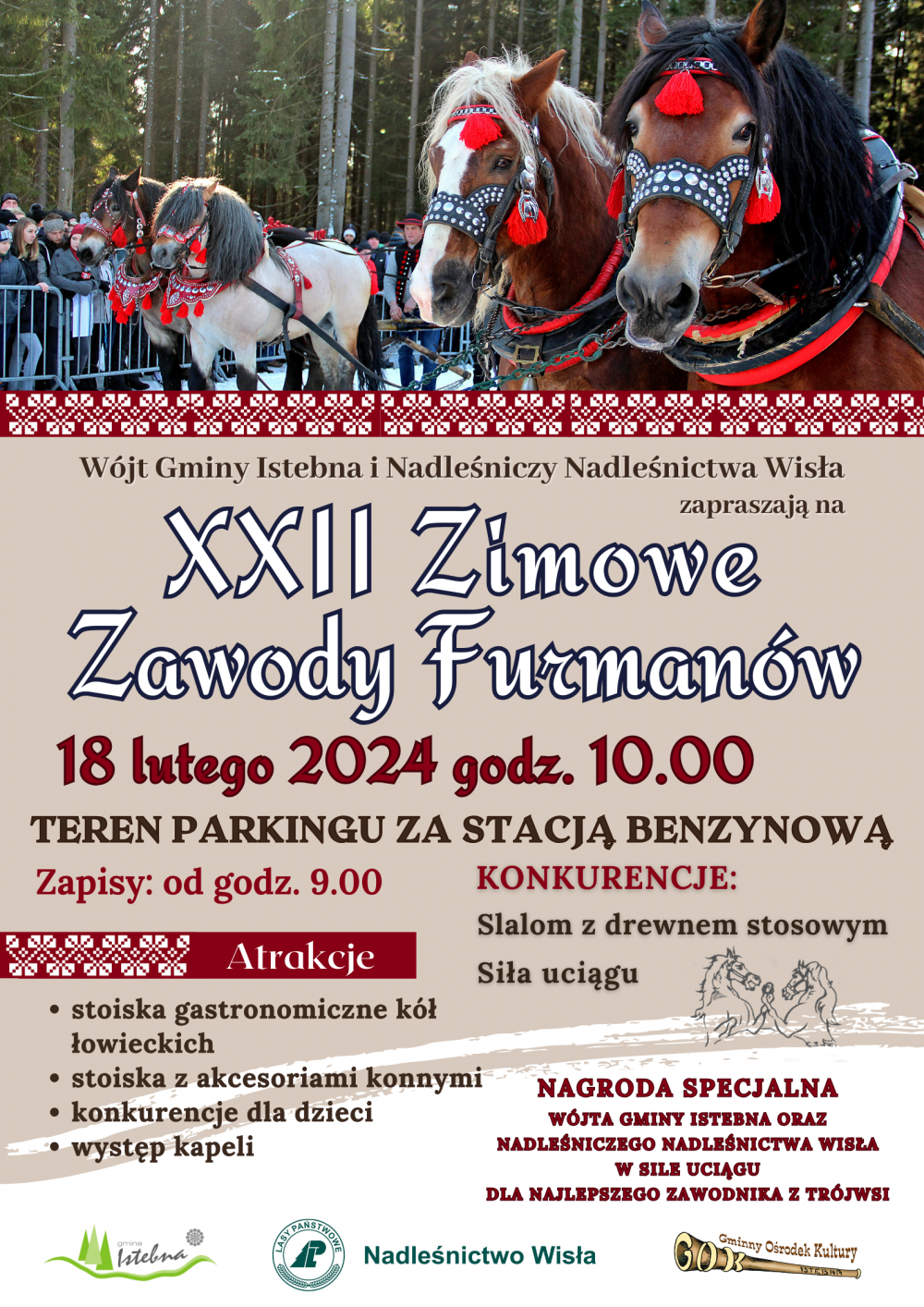 Wójt Gminy Istebna oraz Nadleśniczy Nadleśnictwa Wisła serdecznie zapraszają na tegoroczne XXII Zawody Furmanów, jakie odbędą się 18 lutego na terenie leśnego parkingu za stacją paliw PKN ORLEN w Istebnej.