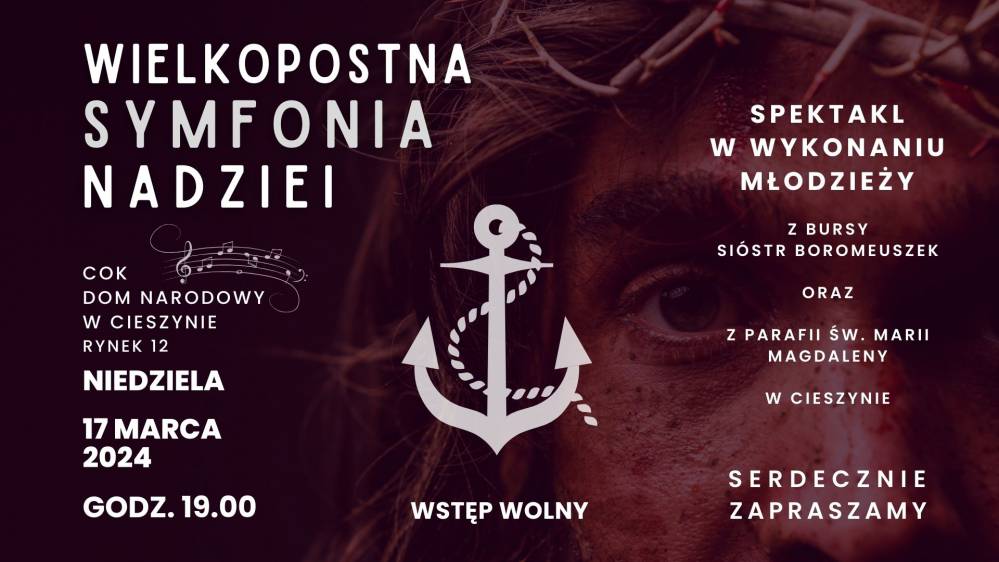 Serdecznie zapraszamy do udziału w "Wielkopostnej Symfonii Nadziei", sektaklu,który odbędzie się w niedzielę, 17 marca o godzinie 19:00w Cieszyńskim Ośrodku Kultury "Dom Narodowy" - COK.