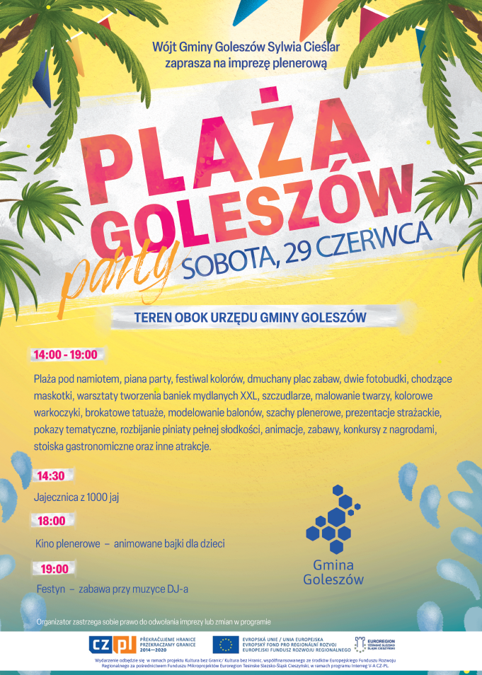 Dzień dziecka na plaży, a dokładnie na Plaży Goleszów! W sobotę, 29 czerwca zapraszamy na tradycyjną już imprezę plenerową, która skierowana jest przede wszystkim do najmłodszych mieszkańców gminy. W programie wiele atrakcji dla dzieci w każdym wieku, występy artystyczne, dmuchańce i tradycyjna już zabawa w pianie! Podobnie jak w latach poprzednich, Plaża Goleszów oraz towarzyszące jej atrakcje zlokalizowane będą na terenie pomiędzy Szkołą Podstawową w Goleszowie a Urzędem Gminy. Początek imprezy o godz. 14.00.