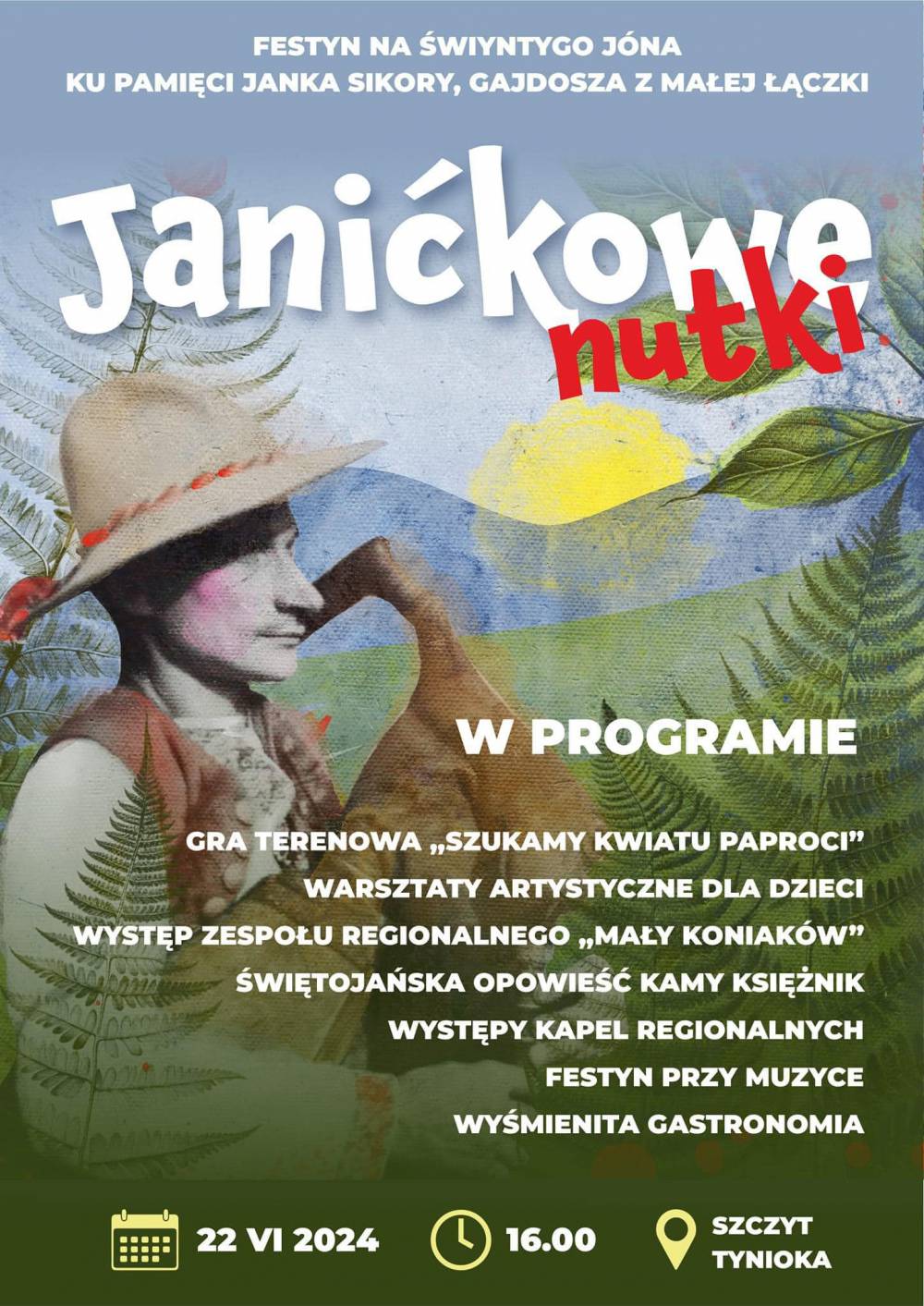 Szkoła Podstawowa Nr 2 im. Gajdosza Jana Sikory w Koniakowie, Karina Czyż i Michał Ligocki zapraszają na Janićkowe Nutki - Festyn na Świyntygo Jóna ku pamięci Janka Sikory Gajdosza z Małej Łączki, który o godz. 16.00 rozpocznie się na szczycie Tynioka.
