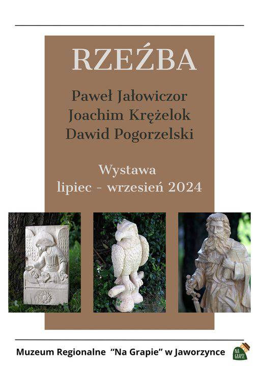 Muzeum Regionalne "Na Grapie" zaprasza na Wystawę rzeźby Pawła Jałowiczora, Joachima Krężeloka i Dawida Pogorzelskiego, która odbędzie się w dniach od 31 lipca 2024 do 30 września 2024.