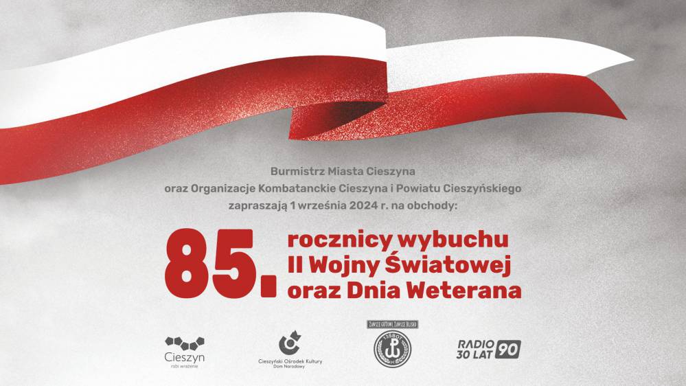 Burmistrz Miasta Cieszyna oraz Organizacje Kombatanckie Cieszyna i Powiatu Cieszyńskiego zapraszają 1 września 2024 r. na obchody 85. rocznicy wybuchu II Wojny Światowej i Dnia Weterana.