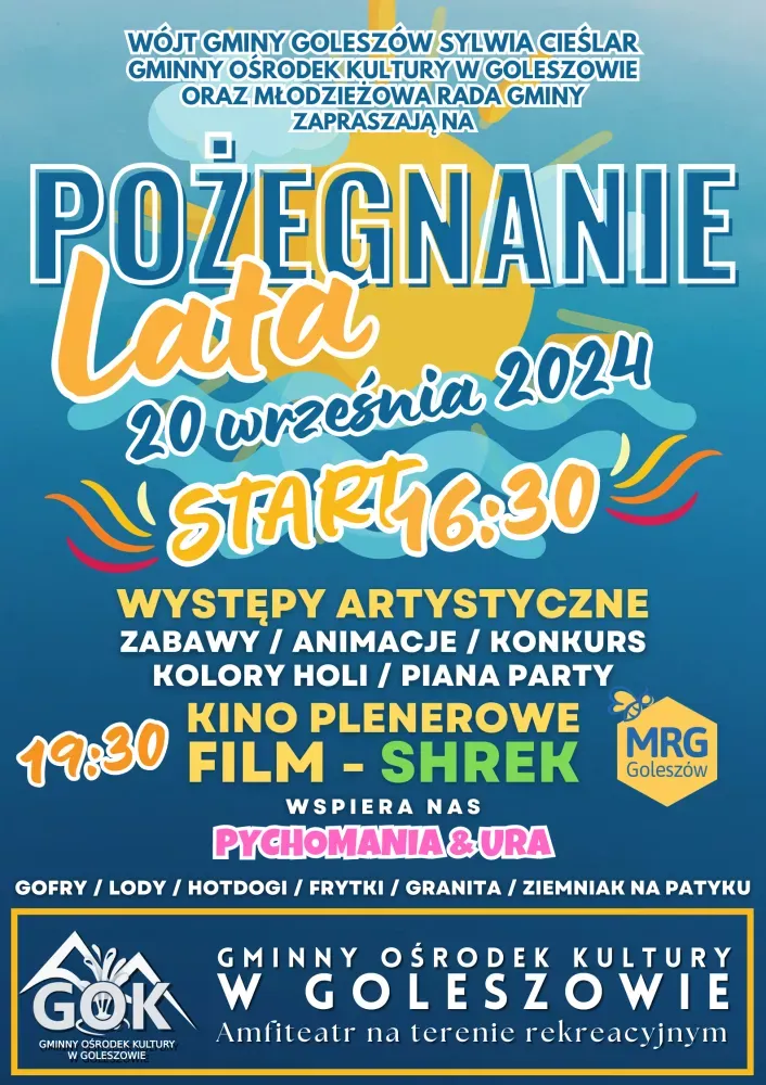 Wójt Gminy Goleszów, Gminny Ośrodek Kultury w Goleszowie oraz Młodzieżowa Rada Gminy Goleszów zapraszają na pożegnanie lata w gminie Goleszów! W piątek, 20 września na terenach rekreacyjnych za goleszowskim ośrodkiem kultury odbędą się pokazy artystyczne, zabawy, konkursy i animacje, kolory holi oraz piana party! Punktem kulminacyjnym imprezy będzie kino plenerowe w goleszowskim amfiteatrze, w ramach którego o godz. 19.30 radni juniorzy zapraszają na projekcję pierwszej części kultowego filmu animowanego "Shrek". W trakcie imprezy nie zabraknie także pysznych przekąsek, w tym gofrów, lodów, hot-dogów, frytek, granity oraz ziemniaków na patyku!