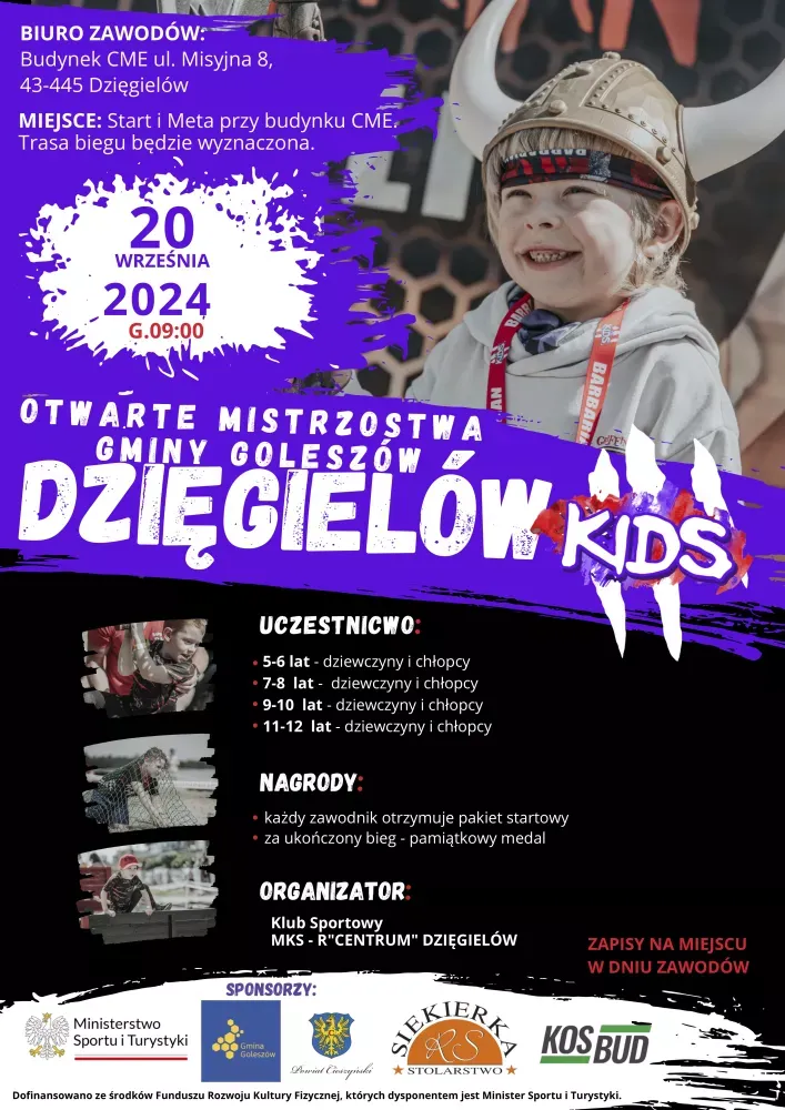 Klub Sportowy MRS-R “Centrum” Dzięgielów zaprasza na otwarte mistrzostwa Gminy Goleszów Barbarian Kids, które odbędą się w piątek, 20 września (start I meta przy budynku Centrum Misji I Ewangelizacji w Dzięgielowie). Zawody rozgrywane będą w czterech kategoriach wiekowych, z podziałem na dziewczyny i chłopców (kategorie wiekowe: 5-6 lat, 7-8 lat, 9-10 lat, 11-12 lat). W ramach uczestnictwa w zawodach każdy zawodnik otrzyma pakiet startowy, a za ukończony bieg – pamiątkowy medal. Biuro zawodów mieścić się będzie w budynku CME w Dzięgielowie przy ul. Misyjnej 8. Zapisy przyjmowane będą w dniu zawodów, których początek wyznaczony został na godz. 9.00.![]()