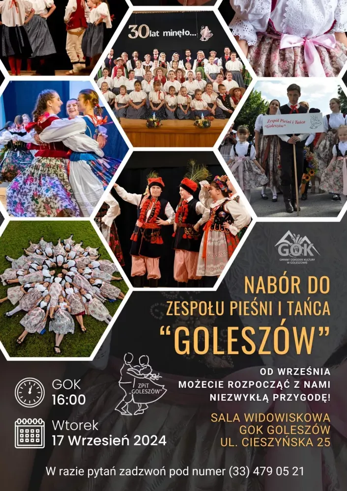 Zespół Pieśni i Tańca Goleszów ogłosił nabór nowych członków. Przygodę z tańcem i muzyką mogą rozpocząć wszyscy, niezależnie od wieku, którzy chcą się poruszać oraz mają mnóstwo energii, oraz kochają folklor. Przy okazji rozpoczętego naboru, Zespół Pieśni i Tańca Goleszów zaprasza na zajęcia pokazowe, które odbędą się we wtorek, 17 września o godz. 16.00 w sali widowiskowej Gminnego Ośrodka Kultury w Goleszowie. ![]()