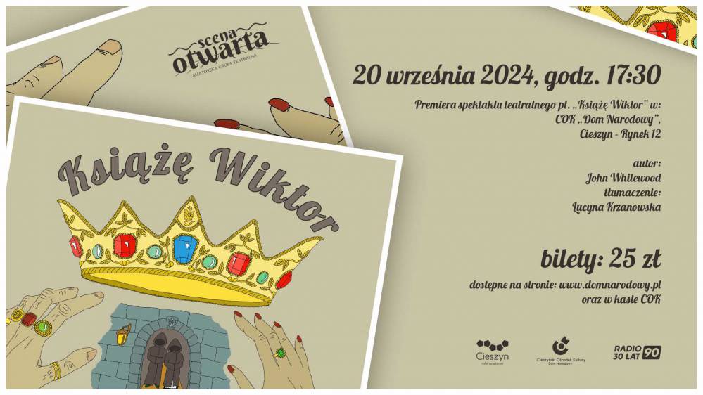 Cieszyński Ośrodek Kultury "Dom Narodowy" zaprasza na najnowszą sztukę Johna Whitewooda pt. "Książe Wiktor". Spektakl w wykonaniu działającej w Domu Narodowym grupy teatralnej Scena Otwarta odbędzie się w piątek 20 września 2024 r. o godzinie 17:30 w Domu Narodowym w Cieszynie!