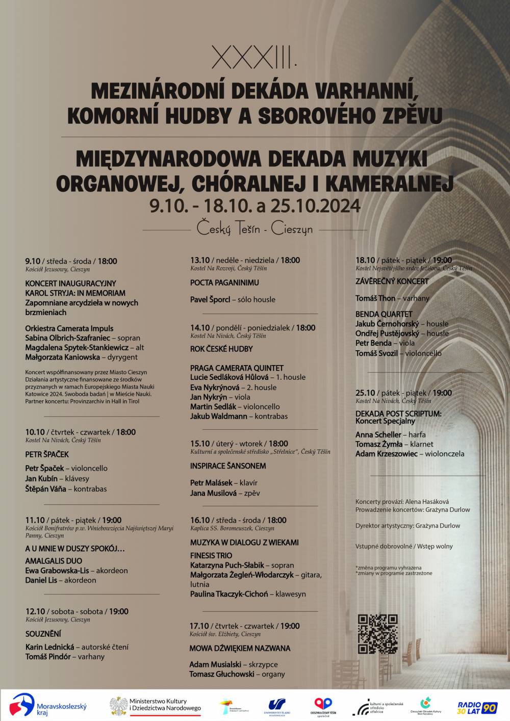 Jak co roku jesienią w Czeskim Cieszynie i Cieszynie rozbrzmiewać będzie muzyka wszystkich epok. Dzieła klasyków i współczesnych artystów wypełnią przestrzenie kościołów po obu stronach Olzy. Wystąpią znakomici wykonawcy, zespoły kameralne i chóry. Serdecznie zapraszamy na koncerty w ramach dekady i mamy nadzieję, że będą one inspirujące dla artystów, słuchaczom zaś dostarczą wielu niezwykłych doznań muzycznych.