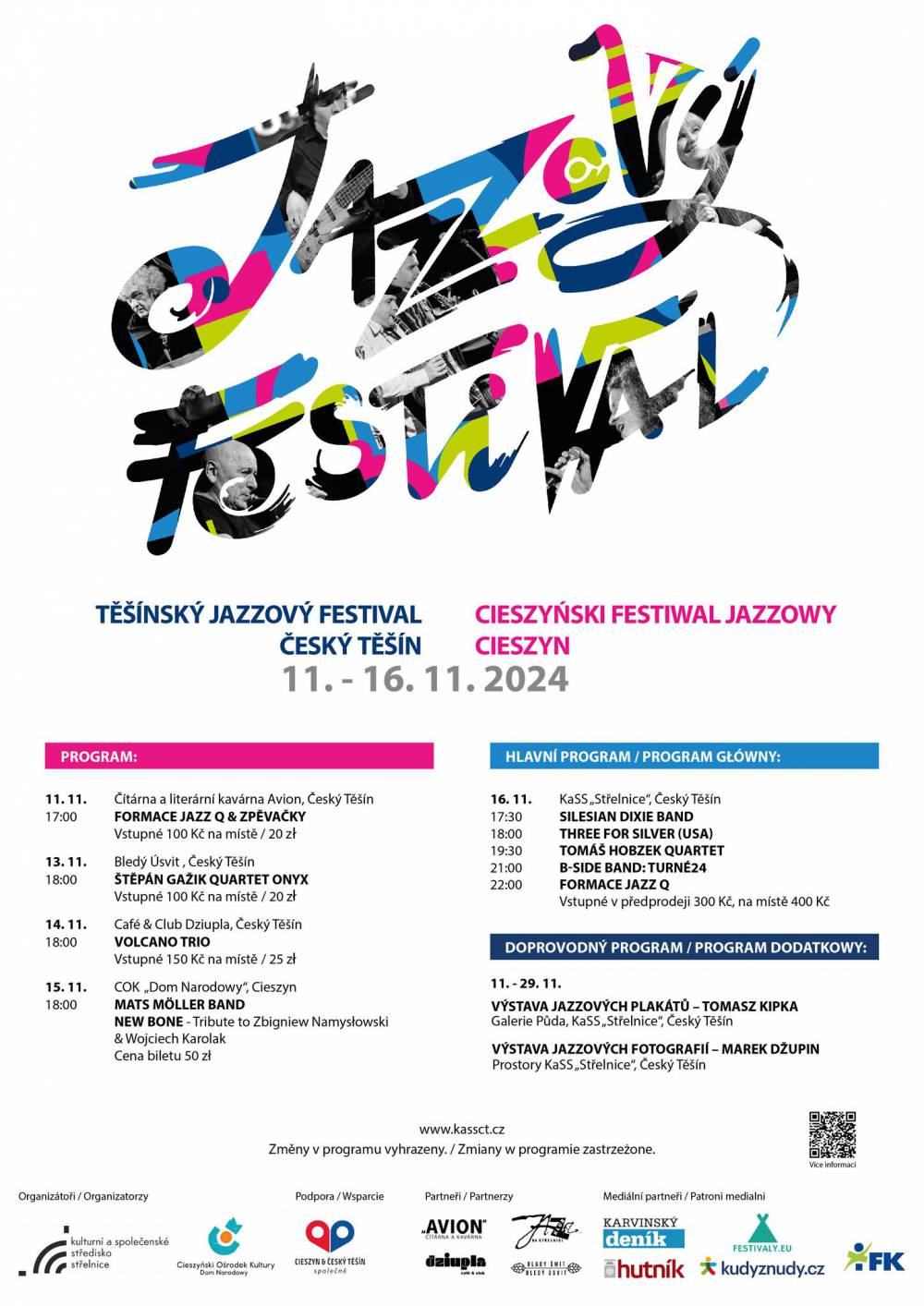 Pierwszy festiwalowy wieczór odbędzie się w kawiarni Avion w Czeskim Cieszynie w poniedziałek 11 listopada o godzinie 17:00, FORMACJA JAZZ Q towarzyszyć będą wokalistki Daniela Dina Sedláčková & Tamara Tomoszek.