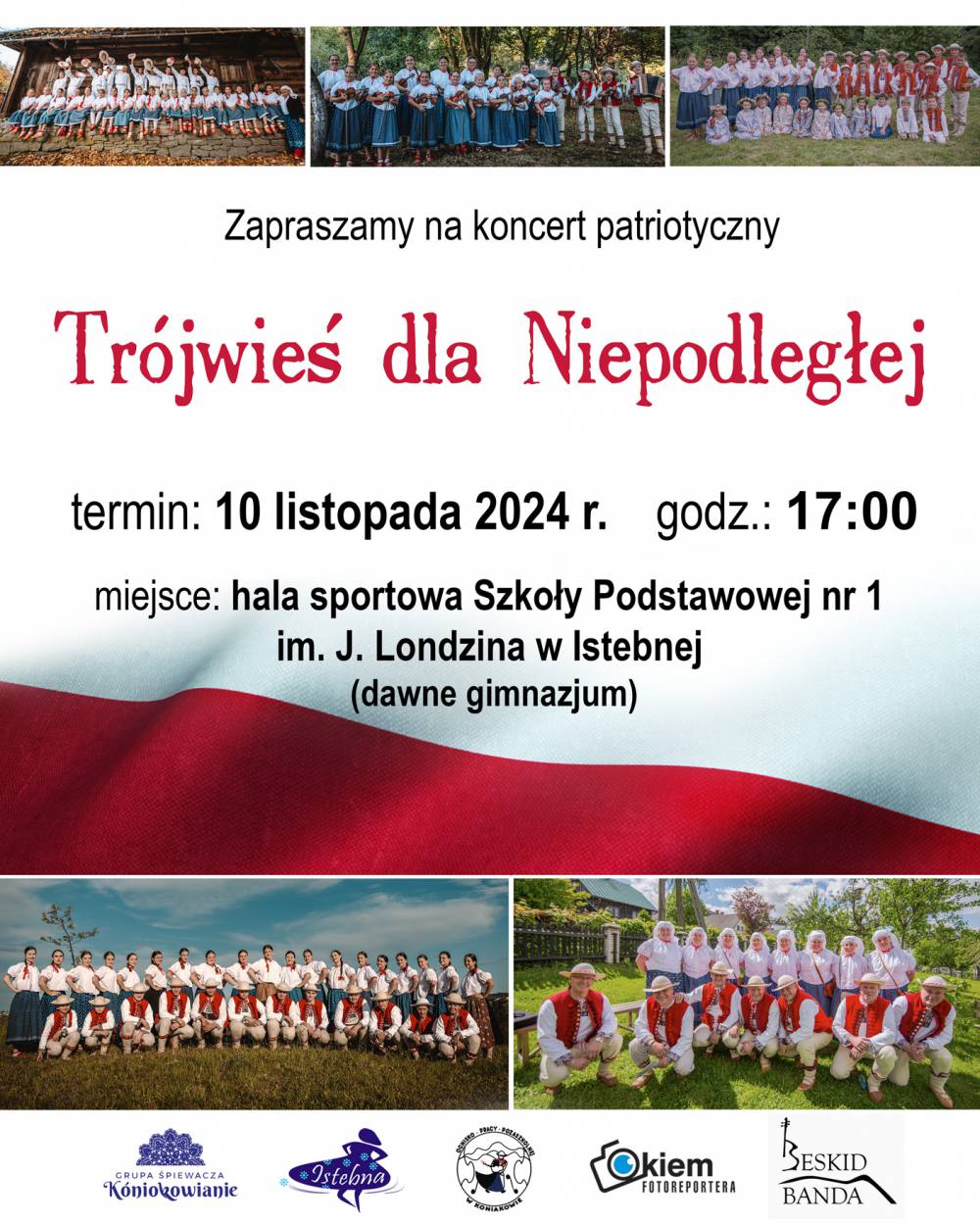 Serdecznie zapraszamy na koncert patriotyczny „Trójwieś dla Niepodległej”, który odbędzie się 10 listopada 2024 o godz. 17.00 w Hali Widowiskowo-Sportowej Zespołu Szkolno - Przedszkolnego w Istebnej.