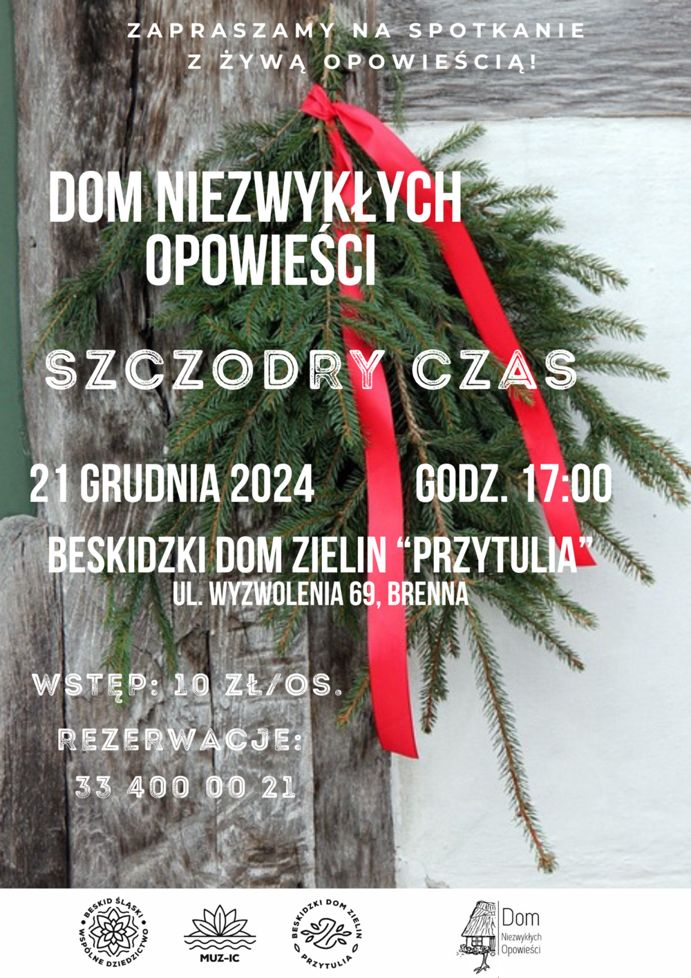 Serdecznie zapraszamy na spotkanie z żywą opowieścią. W Beskidzkim Domu Zielin "Przytulia" już 21 grudnia o 17:00 odbędzie się kolejny spektakl Domu Niezwykłych Opowieści. "Szczodry Czas" to zestaw historii o świętach - o tym, jak je dawniej przeżywano, jakie się wiązały z nimi obrzędy i tajemnice, jakie ludzie miewali podczas nich przygody.