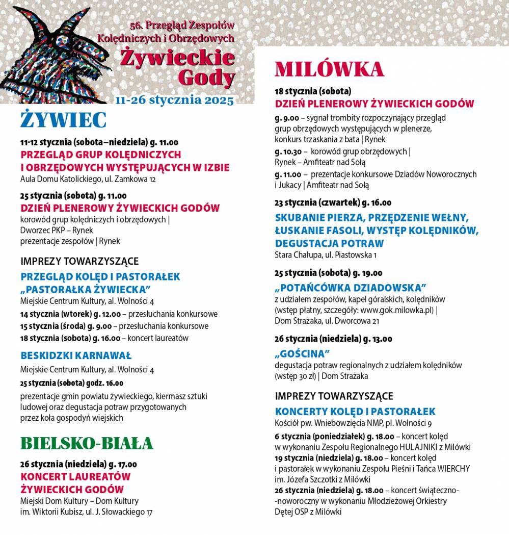 Żywieckie Gody to jedna z największych i najstarszych imprez folklorystycznych na Żywiecczyźnie. W ramach imprezy odbywają się przeglądy zespołów kolędniczych i obrzędowych, konkursy trzaskania z bata, degustacja potraw regionalnych oraz wiele, wiele innych. Założeniem programowym “Żywieckich Godów” jest kultywowanie i popularyzacja ludowych obrzędów i tradycji Z związanych z okresem od początku grudnia poprzez święta Bożego Narodzenia, zwyczaje noworoczne i karnawałowe, do rozpoczęcia okresu Wielkiego Postu. Charakterystycznym elementem Żywieckich Godów są  grupy kolędnicze, zwane "dziadami noworocznymi" oraz „szlachcicami”. Są to grupy ludzi przebranych za najróżniejsze postacie, gdzie każda z nich jest odzwierciedleniem jakiejś cechy. Impreza organizowana jest w styczniu zarówno w Żywcu jak i w Milówce i cieszy się ogromnym zainteresowaniem zarówno wśród mieszkańców jak i turystów.