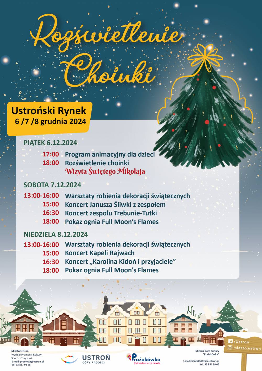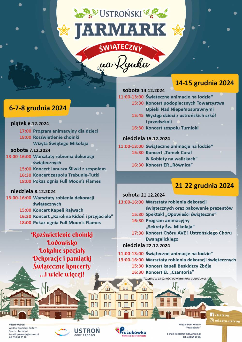 Krok po kroczku, idzie grudzień! Już dzisiaj chcemy zaprosić na Ustroński Jarmark Świąteczny – pełny smaków, zapachów, świateł, kolorów i świątecznych dźwięków. Jarmarki rozpoczynamy 6 grudnia o godz. 17:00 rozświetleniem choinki na Rynku. Będzie dużo dobrej zabawy, animacje dla dzieci, słodkości i oczywiście Święty Mikołaj. Przez trzy kolejne weekendy zapraszamy na warsztaty robienia świątecznych dekoracji, klimatyczne koncerty, świąteczne opowieści, animacje i pokazy na lodowisku, z którego mozna będzie korzystać, jednocześnie słuchając kolędowania ze sceny.