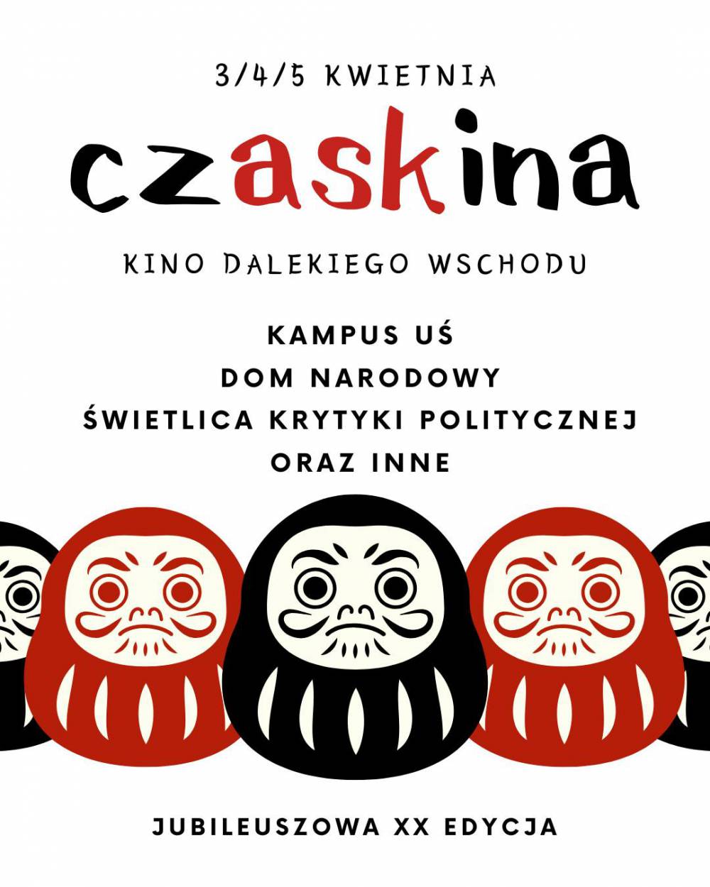 Zapraszamy na jubileuszową 20. edycję studenckiego przeglądu filmowego czASKina, która odbędzie się w dniach 3, 4 i 5 kwietnia 2025r. Tegoroczna odsłona imprezy skupi się na kinie i kulturze Azji, a w szczególności Japonii, Korei i Chin. W programie tegorocznej edycji imprezy skierowanej w równym stopniu do cieszyńskich studentów, uczniów oraz mieszkańców Cieszyna znalazły się m.in. cztery projekcje filmowe, warsztaty parzenia herbaty oraz origami, pokaz Tai Chi, a także prezentacja wspomnień z podróży do Chin.
