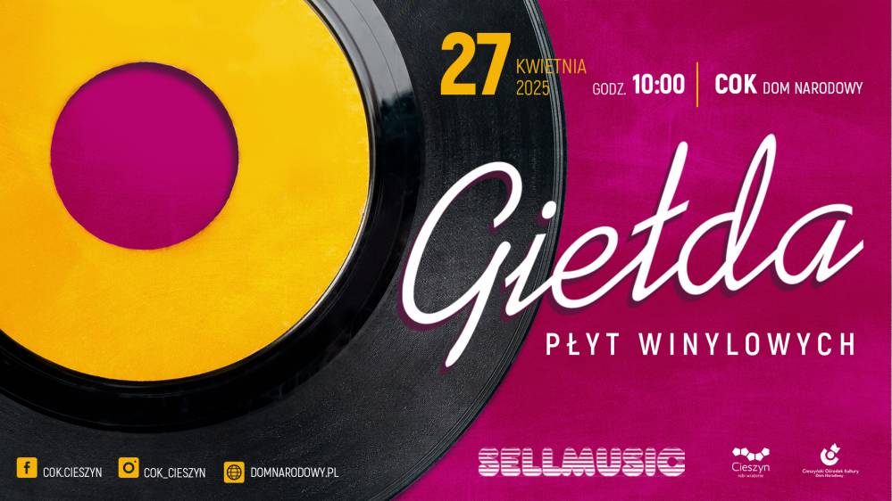 Giełda Płyt Winylowych wróciła do Cieszyna! Cieszyński Ośrodek Kultury "Dom Narodowy" i Sellmusic zapraszają 27 kwietnia 2025 r. na kolejne spotkanie miłośników fizycznych nośników, płyt winylowych, cd, kaset magnetofonowych, które odbędzie się w niedzielę 27 kwietnia 2025 o godzinie 10:00 w Domu Narodowym w Cieszynie.