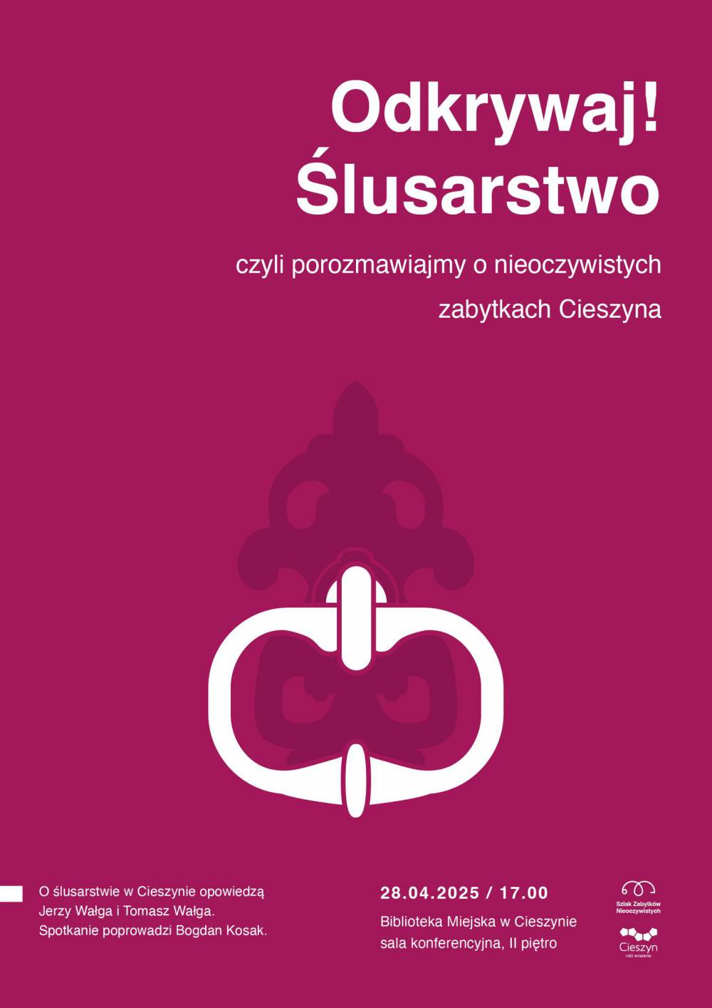 Biblioteka Miejska w Cieszynie zaprasza 28 kwietnia 2025r na spotkanie: ŚLUSARSTWO, czyli porozmawiajmy o nieoczywistych zabytkach Cieszyna. Spotkanie poprowadzi Bogdan Kosak, pomysłodawca i koordynator projektu. Gośćmi kwietniowego spotkania będą Jerzy Wałga i Tomasz Wałga, bez których trudno sobie wyobrazić rozmowę na temat ślusarstwa w Cieszynie.