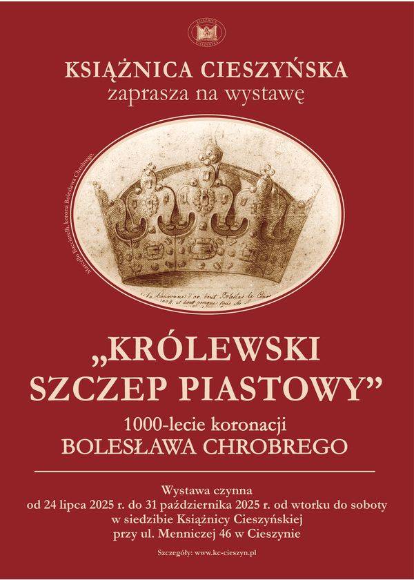 Książnica Cieszyńska zaprasza na wystawę: „KRÓLEWSKI SZCZEP PIASTOWY”. 1000-lecie koronacji Bolesława Chrobrego. Wernisaż wystawy odbędzie się 24 lipca 2025 (czwartek) o godz. 15:30. Wystawę będzie można zobaczyć do 31 października 2025 r.