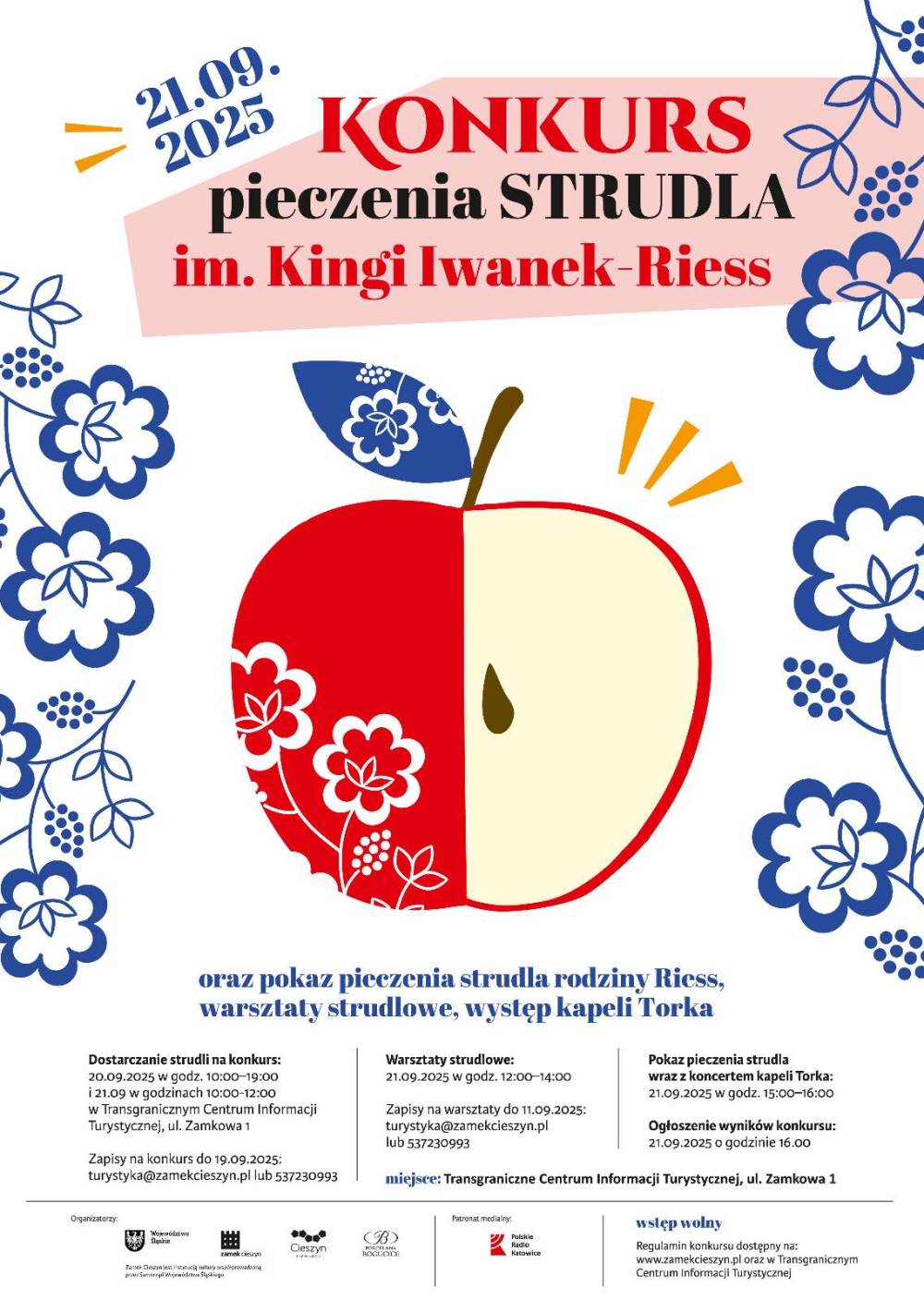 Zapraszamy do udziału w konkursie pieczenia strudla im. Kingi Iwanek-Riess, któremu towarzyszyć będzie pokaz pieczenia strudla rodziny Riess, warsztaty strudlowe oraz występ kapeli Torka. Wydarzenie odbędzie się w niedzielę, 21 września w Transgranicznym Centrum Informacji Turystycznej w Cieszynie (ul. Zamkowa 1).
