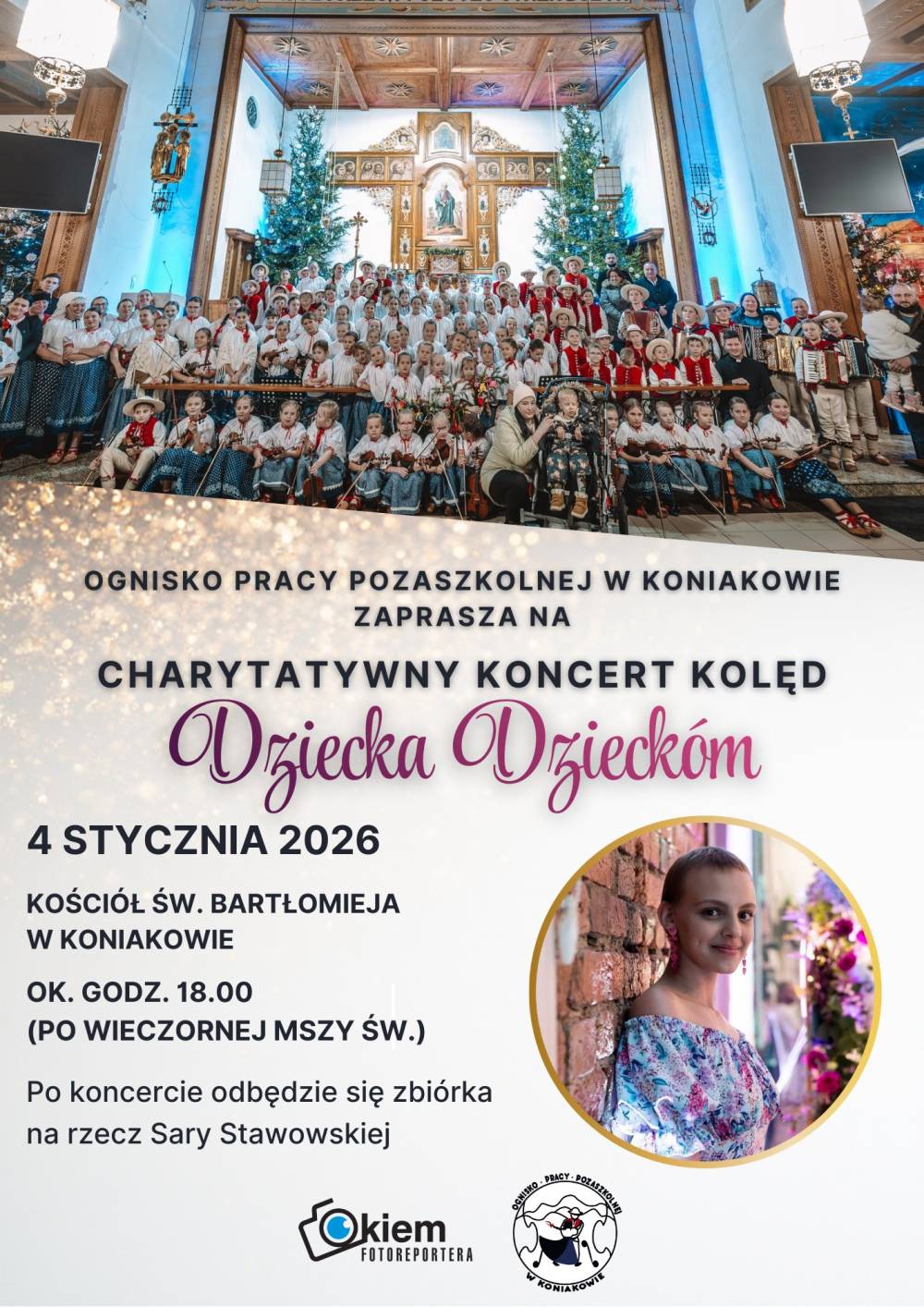 Działający pod auspicjami Ogniska Pracy Pozaszkolnej Zespół Regionalny "Mała Istebna" zaprasza na Charytatywny Koncert Kolęd Dziecka Dzieckom, który odbędzie się w niedzielę 4 stycznia 2026 o godz. 18.00 w koniakowskim kościele.