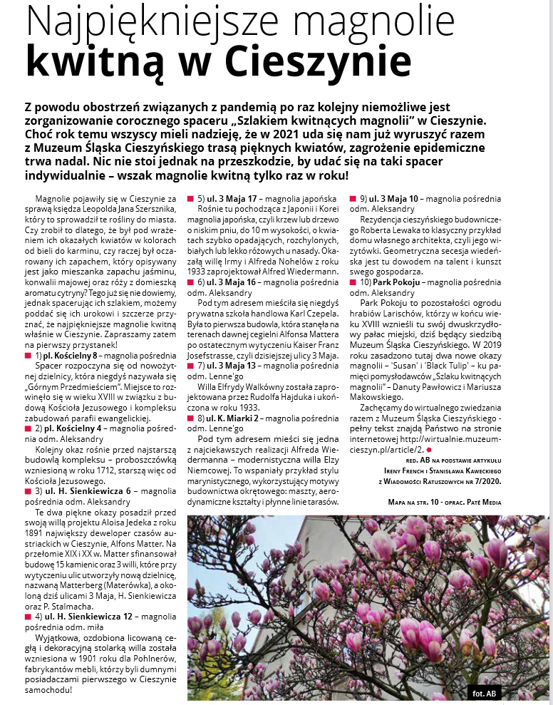 Z powodu obostrzeń związanych z pandemią niemożliwe jest zorganizowanie przez Muzeum Śląska Cieszyńskiego corocznego spaceru „szlakiem kwitnących magnolii” w Cieszynie.  Jednak nic nie stoi na przeszkodzie, by udać się na taki spacer indywidualnie – wszak magnolie kwitną tylko raz w roku.