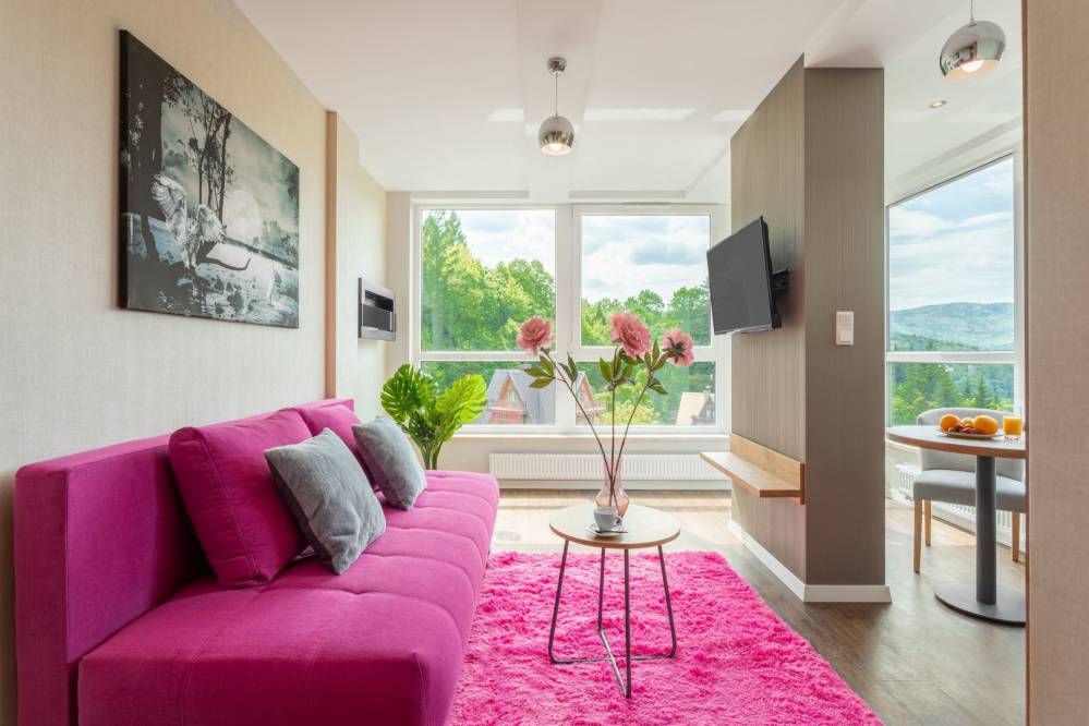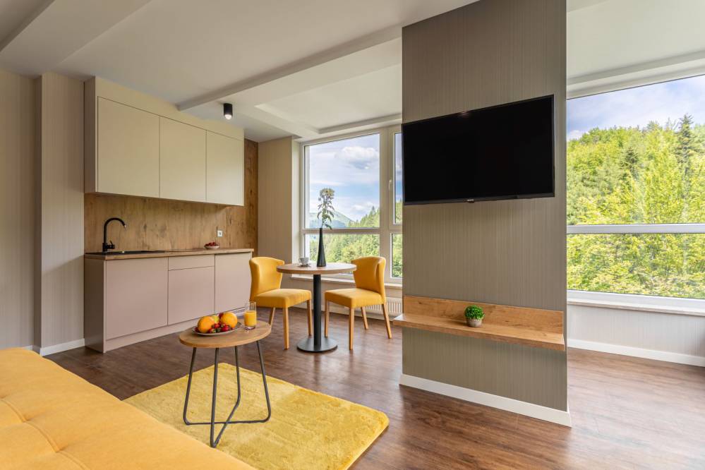 Na ośmiu piętrach inwestycji znajdują się 54 apartamenty. Większość mieszkań posiada dwa pokoje, na które składa się salon z aneksem kuchennym i sypialnią oraz łazienka. Z każdego mieszkania roztacza się widok na wszechobecną naturę – w zależności od usytuowania możliwy jest widok na góry, dolinę, potok lub las. W ofercie znajdują się również apartamenty z tarasami o powierzchni od 10 do 70 metrów kwadratowych. Dla osób poszukujących większej przestrzeni przewidziano dwa dwupoziomowe apartamenty na ostatniej kondygnacji.