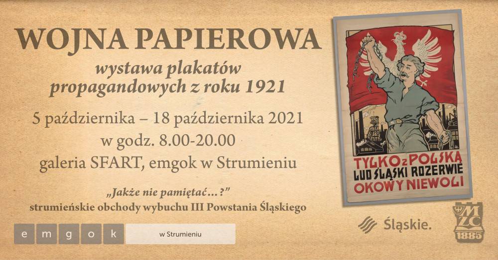 Stowarzyszenie Macierz Ziemi Cieszyńskiej – Towarzystwo miłośników Regionu, Macierz Ziemi Cieszyńskiej – Koło w Strumieniu i Miejsko-Gminny Ośrodek Kultury w Strumieniu zapraszają do zwiedzenia wystawy „Wojna Papierowa”. wystawa dostępna od 5 do 18 października 2021 r. w godzinach 8.00-20.00 w galerii SFART w holu Miejsko-Gminnego Ośrodka Kultury w Strumieniu (ul. Młyńska 14).