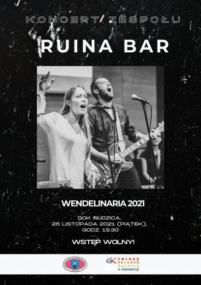 Zwieńczeniem dwudniowych spotkań w ramach „Wendelinarii 2021” będzie piątkowy (godz. 19.30) koncert zbierającego entuzjastyczne recenzje zespołu RUINA BAR. To warszawska grupa grająca alternatywnego soft-rocka z domieszką wielu różnych stylów. RUINA BAR przybywa do Rudzicy z muzycznym lekarstwem na jesienne niemoce i zgryzoty. Wkrótce ukaże się ich debiutancki album "Tango na tłuczone talerze" (Klamka Music Records).