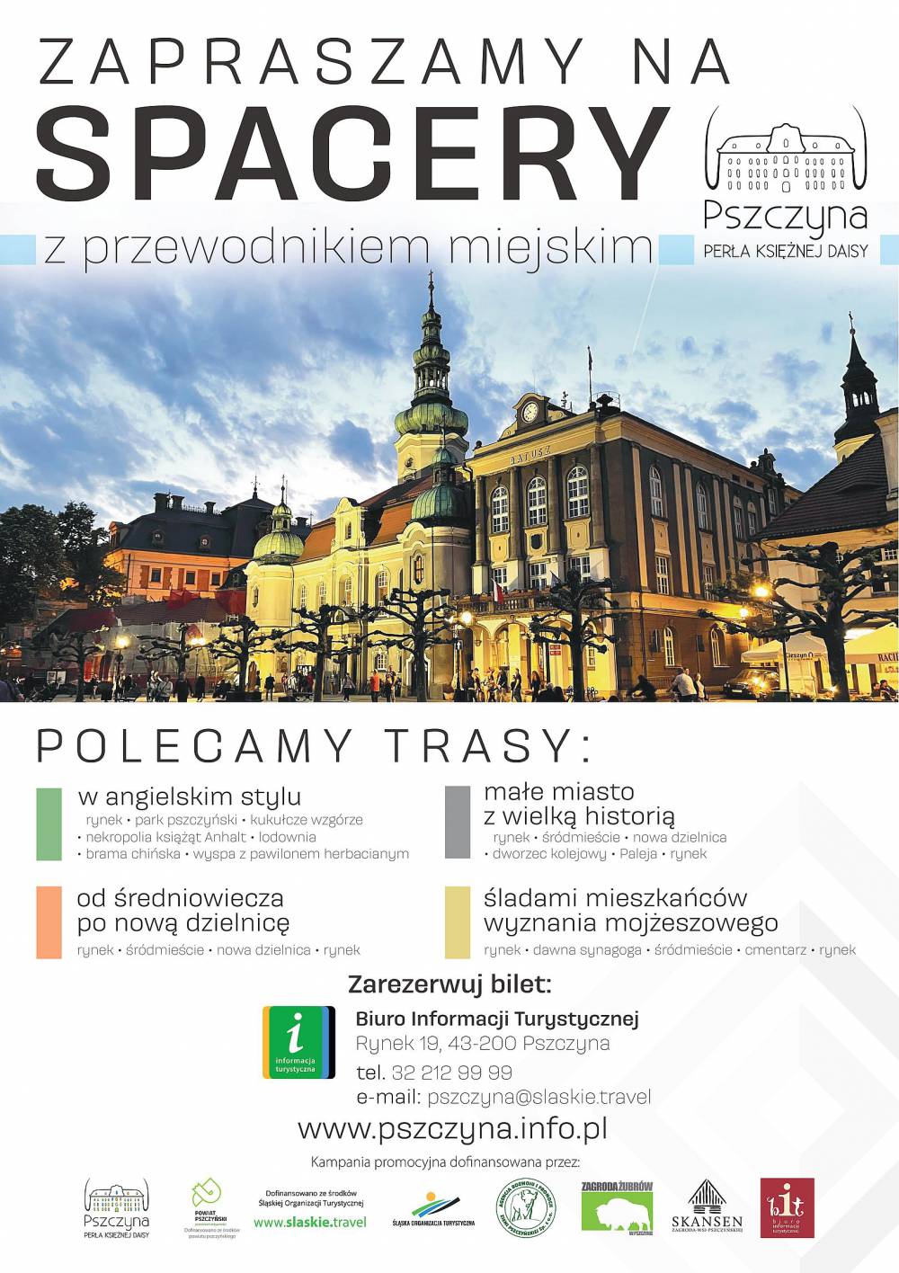 Zapisy na spacery po Pszczynie z przewodnikiem miejskim przyjmowane są osobiście, mailowo (pszczyna@slaskie.travel) i telefonicznie (32 212 99 99) w Biurze Informacji Turystycznej, Rynek 19. Więcej informacji: www.pszczyna.info.pl.